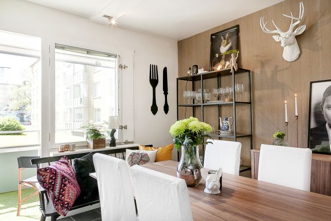 Un set de tacamuri gigant, o furculita si un cutit, ambele metalice, negre sunt asezate pe perete alb, capul de cerb cu ochelari negri si tablourile ilustrand posturi masculine sunt doar cateva din detaliile acestui spatiu plin de personalitate.