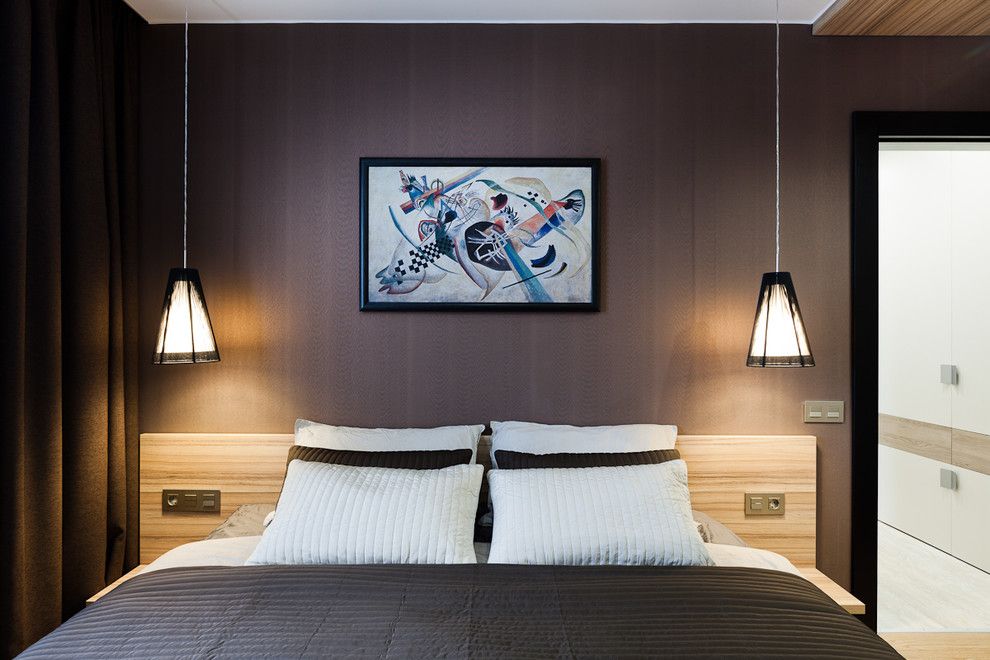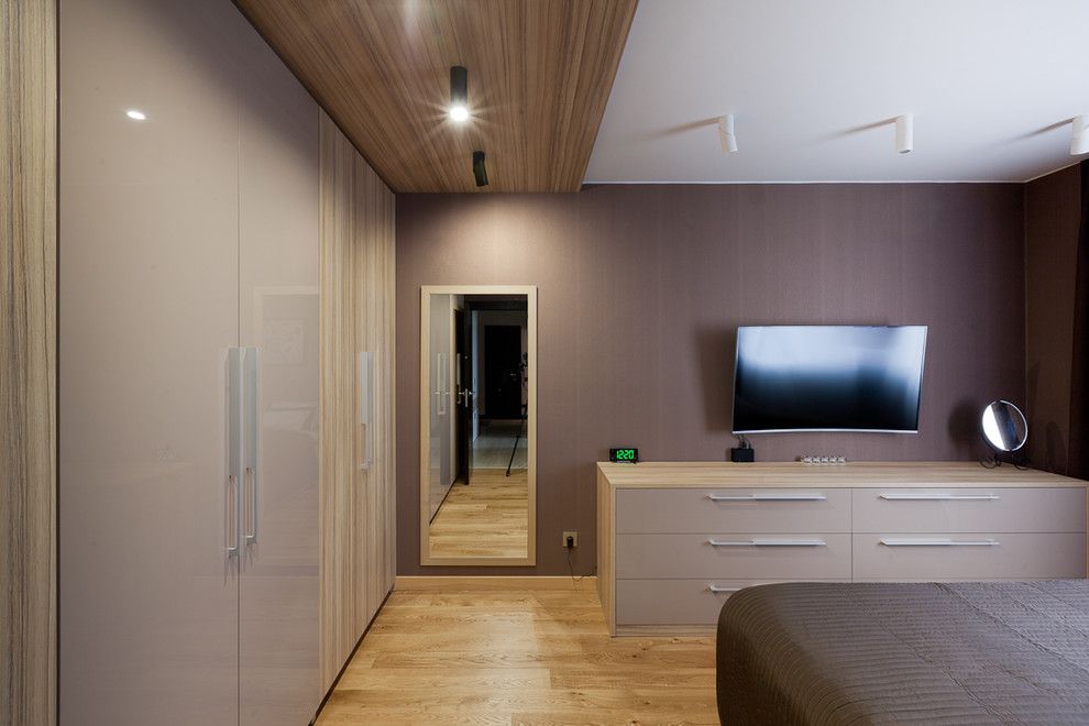 Pentru dormitor s-au ales nuante mai blande, mai relaxante, in tonuri usor mai inchise, ciocolatii. Excelent conturat dormitorul oferind spatii de depozitare generoase prin cele 3 seturi de dulapuri si comoda cu 3 randuri de sertare adanci. De remarcat cum sunt evidentiate dulapurile in incercarea de a contura ideea unei zone de dressing separate de spatiul de dormit.