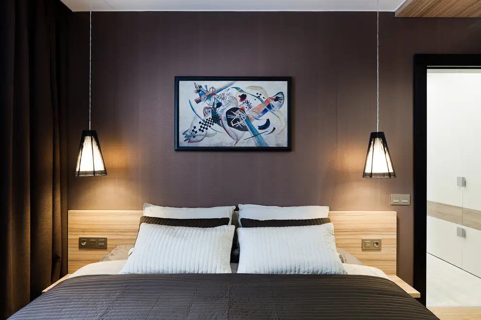 Tablia de pat se continua lateral de ambele parti ale patului, redand ideea de noptiere.