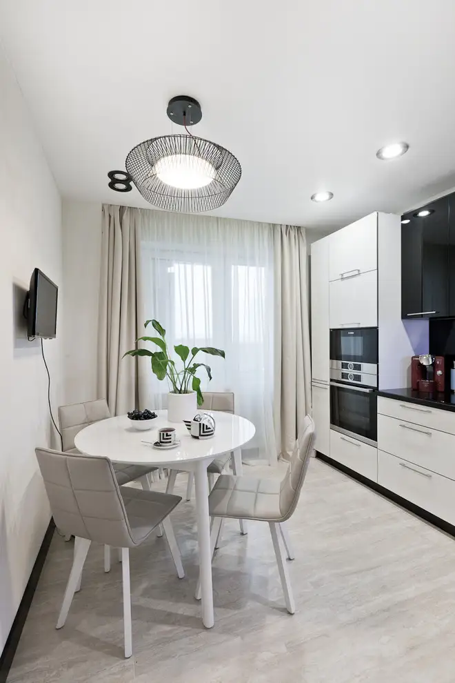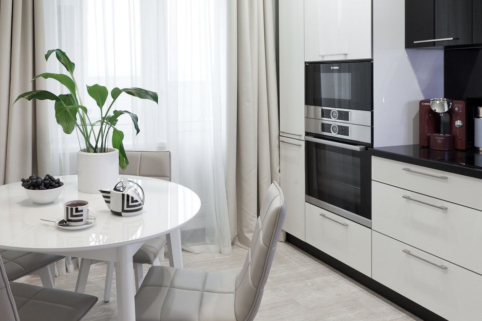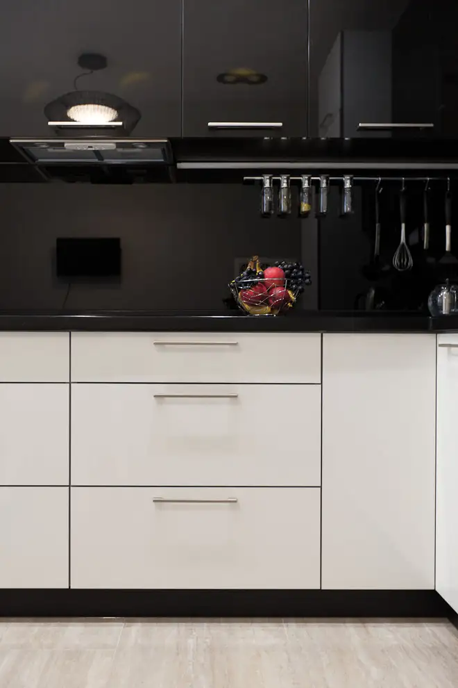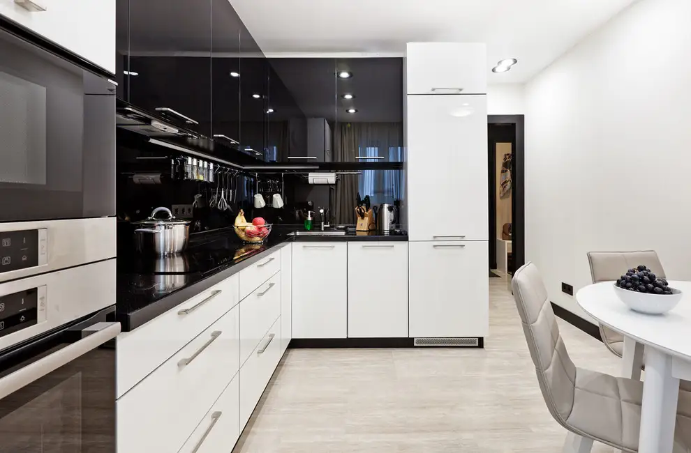 Tematica alb-negru o regasim transpusa si la nivelul bucatariei. Amenajarea merge spre o latura dramatica, pastrand latura functionala a camerei. Finisajul lucios al mobilierului reflecta lumina si amplifica cumva spatiul.