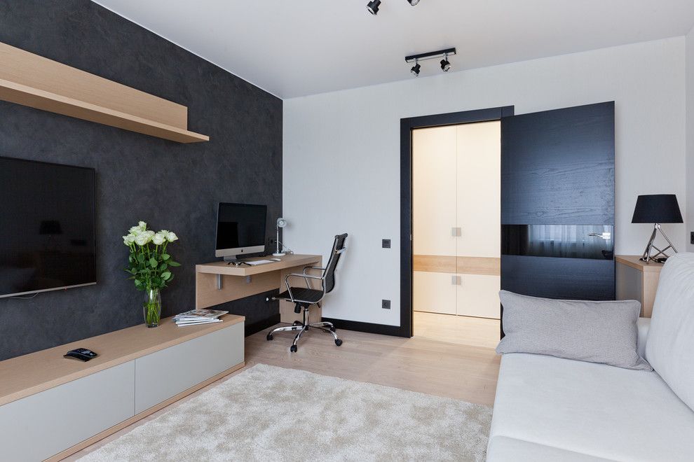 Zona de accenteste cea a peretelui vopsit cu negru pe care se afla televizorul si o parte din corpurile mobilierului. Partea superioara a peretului este prevazuta cu o polita lunga care poate fi folosita drept suport pentru carti sau decoratiuni. In spatiul din capatul camerei a fost amenajat un birou, sub forma unui blat mai gros, urmand linia designului politei anterior mentionate.