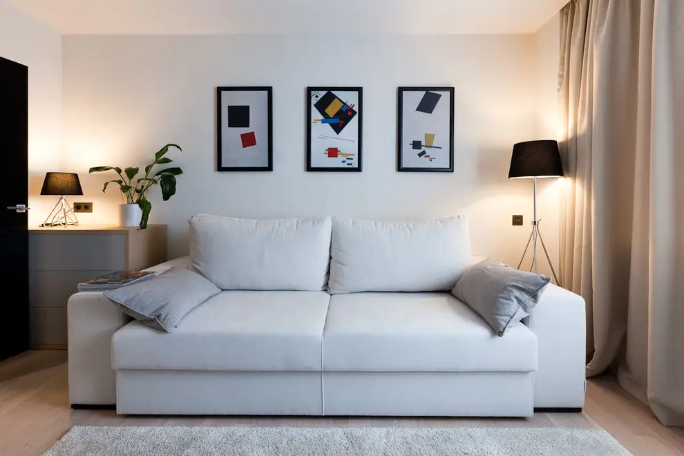 De partea cealalta, asezat oarecum in contrast, regasim canapeaua si o comoda cu 3 sertare. Lampadarul cu abajur negru, ramele tablourilor sau tocul usii, toate negre subliniaza contrastul acesta cromatic intr-un mod coerent. Cremul si bejul, precum si nuanta deschisa a lemnului de la nivelul pardoselii predomina vizual in incapere, echilibrand decorul.