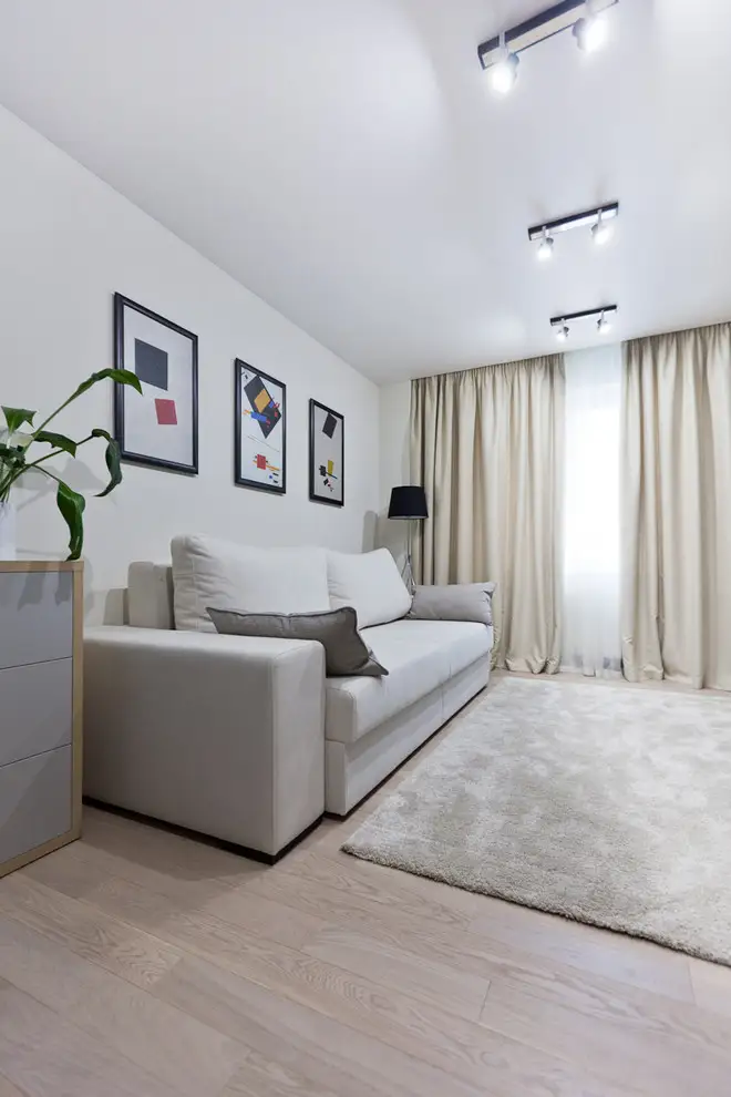In living predomina mobilier de inaltime medie sau joasa. Corpul tip consola de sub televizor, comoda sunt 2 exemple de mobilier potrivit pentru un astfel de spatiu precum cel din apartamentul nostru.