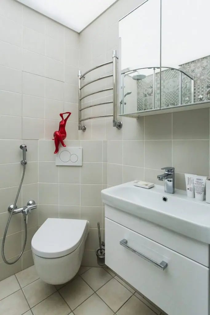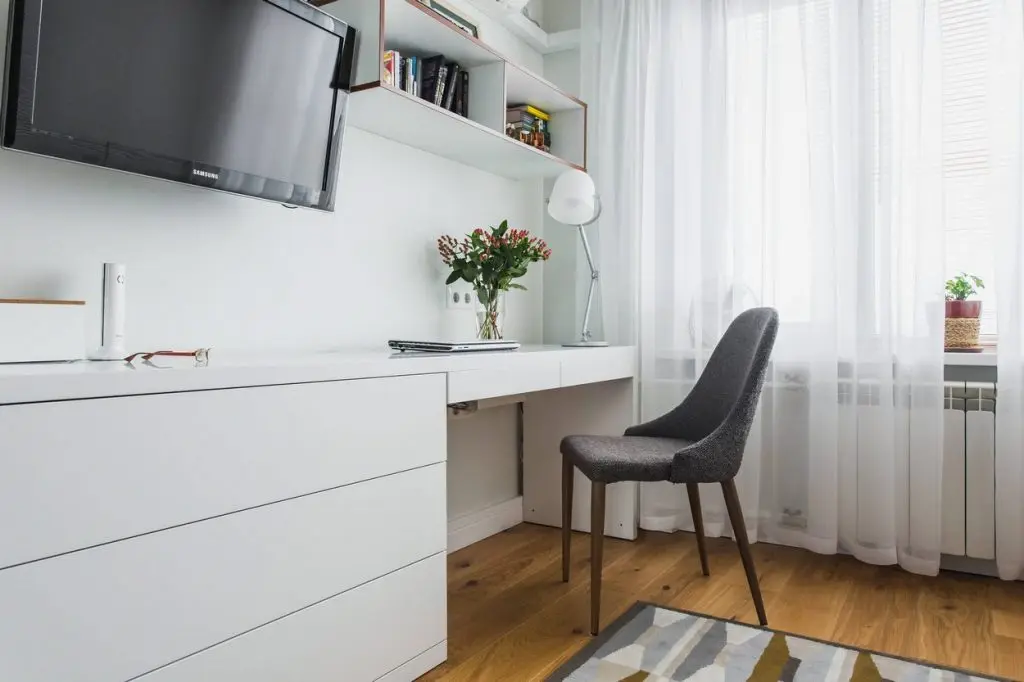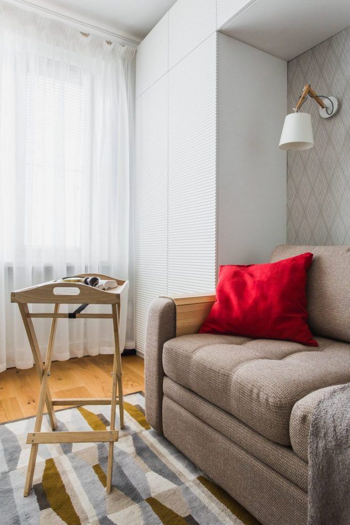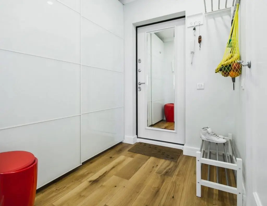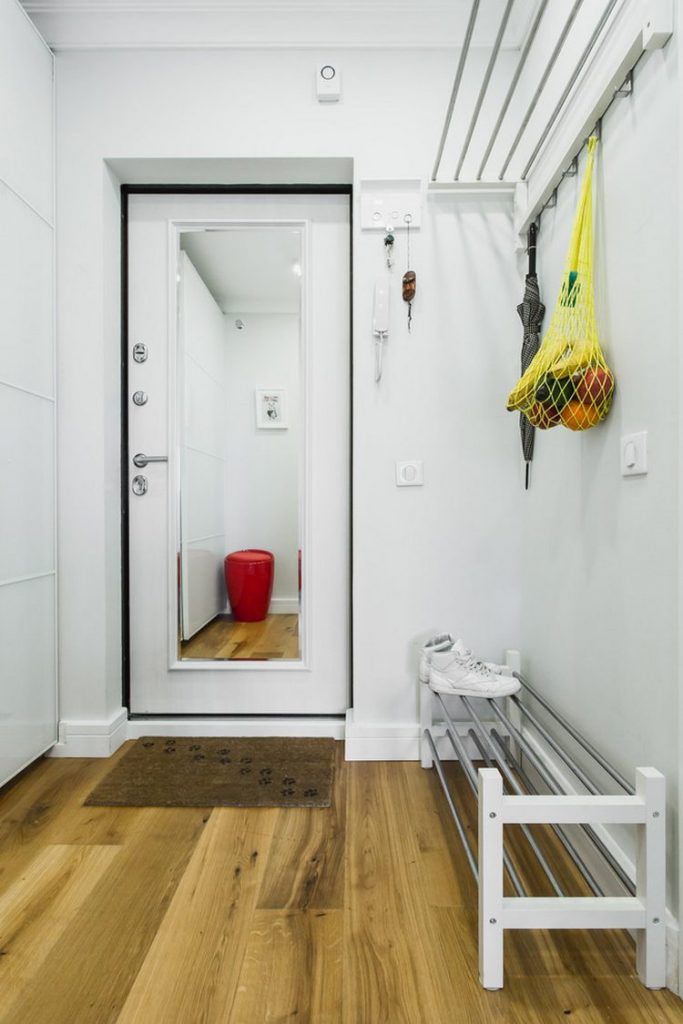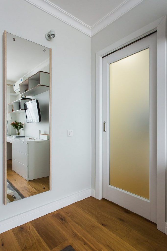 Oglinda montata chiar langa usa de la intrare in camera ascunde o masa de calcat fixata pe un dispozitiv care gliseaza. In plus, oglinda creeaza impresia de largire a spatiului, un efect pe care ti-l doresti sa-l obtii atunci cand locuiesti intr-o camera mica.