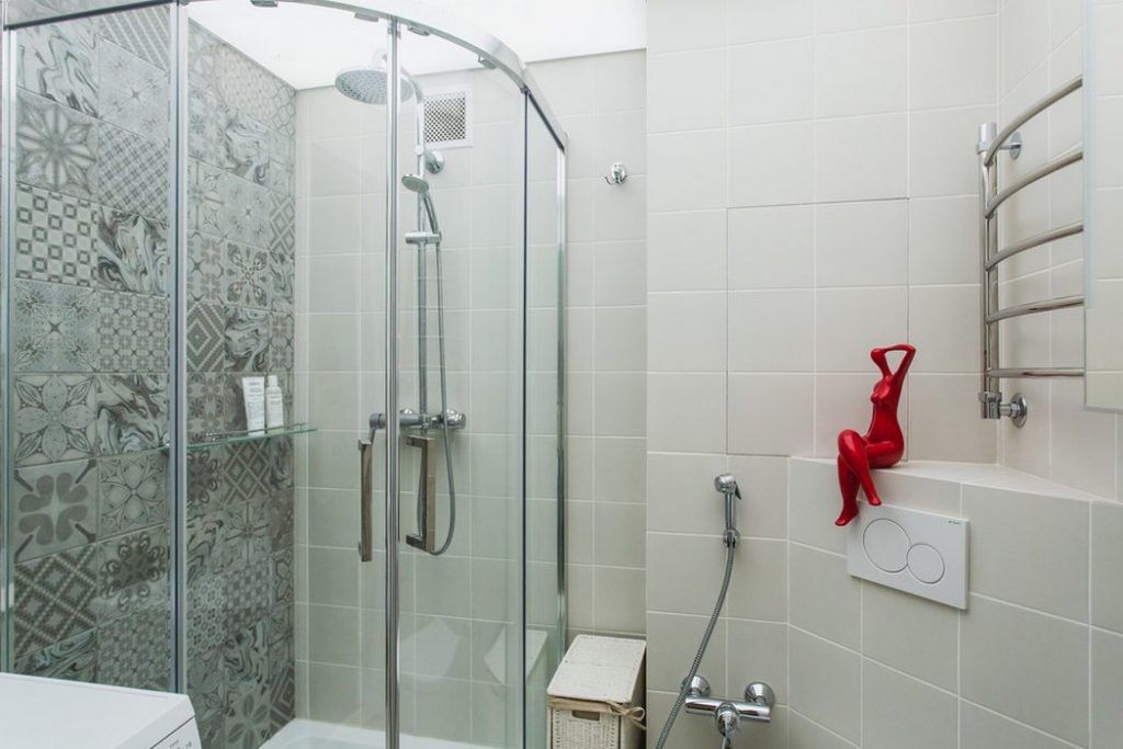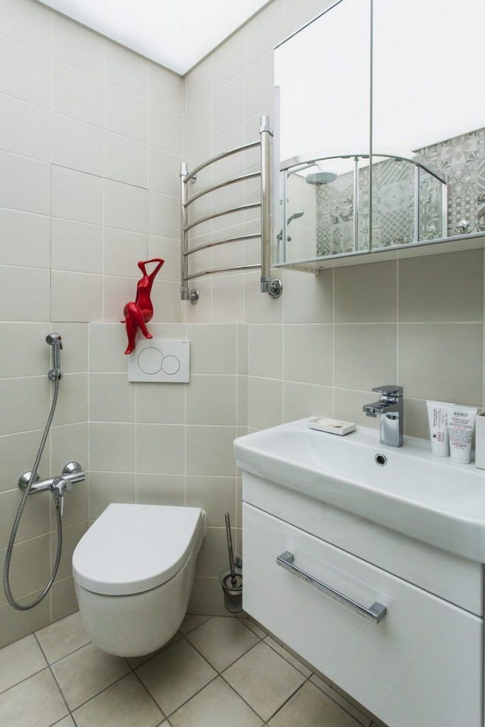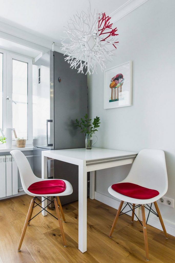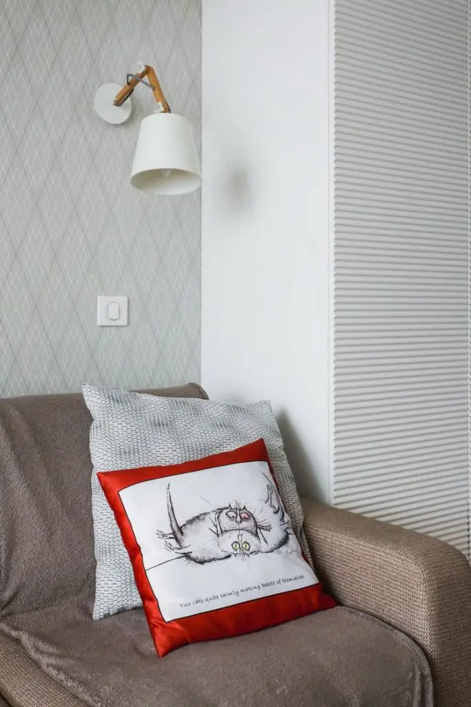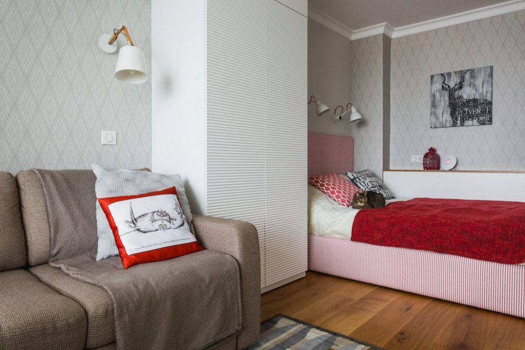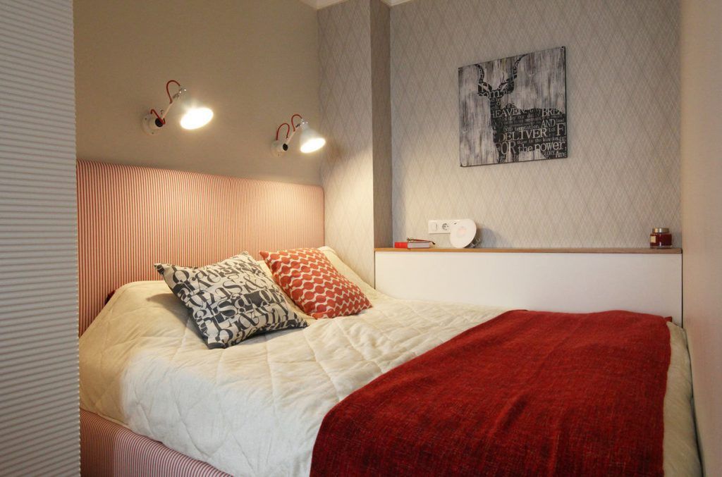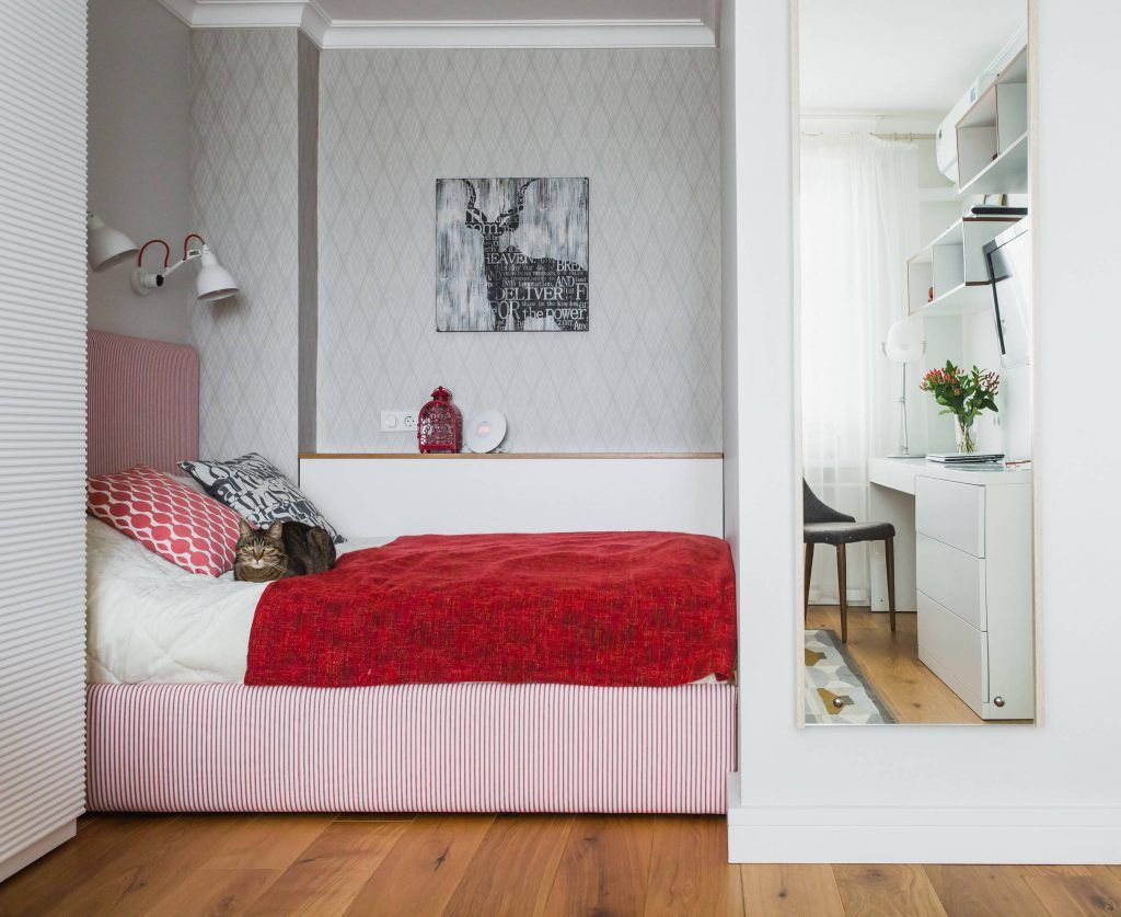 Pentru ca interiorul sa nu para plictisitor de la prea mult alb, cei doi au optat pentru un model de tapet discret, dispus pe peretele cu depozitarea si cel cu patul. Accentele colorate ale accesoriilor, in special rosul, atrag atentia si confera un plus de dinamica spatiului.