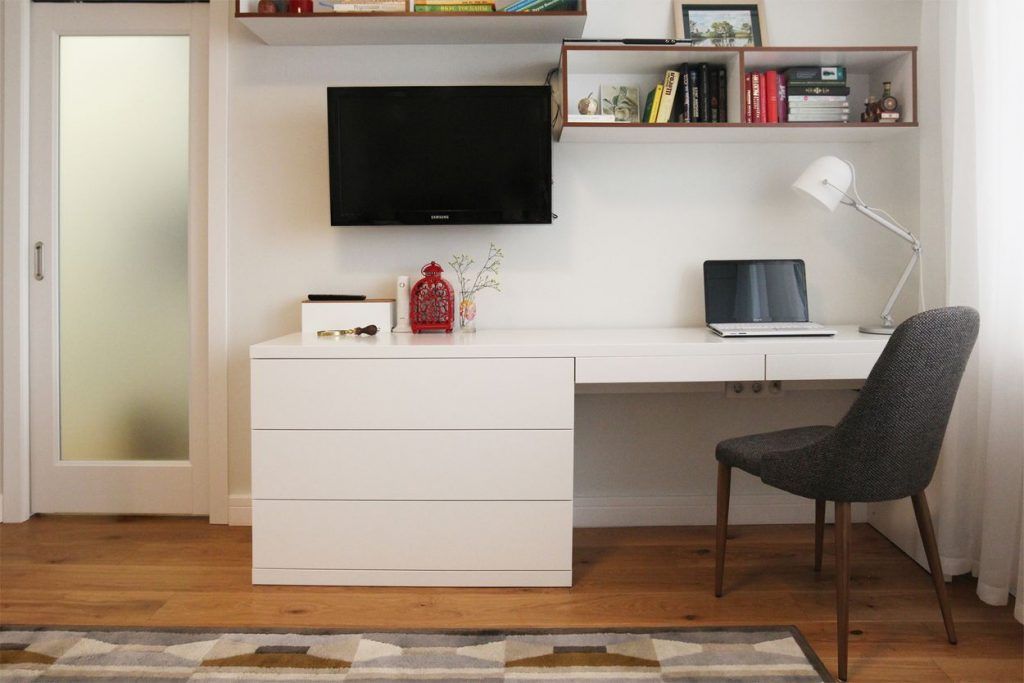 Camera principala indeplineste un rol cu multiple functii; avem o zona de living, cu canapea, zona T V, spatiu pentru birou, dar si zona de dormit. O parte din depozitare este evidentiata prin dulapurile dispuse simetric de o parte si cealalta a canapelei, plus rafturile de deasupra biroului. In plus, a fost conceputa pe comanda si o lada, fixata intre perete si pat, lada ce preia si ea o parte din lenjerii, pilote sau perne.