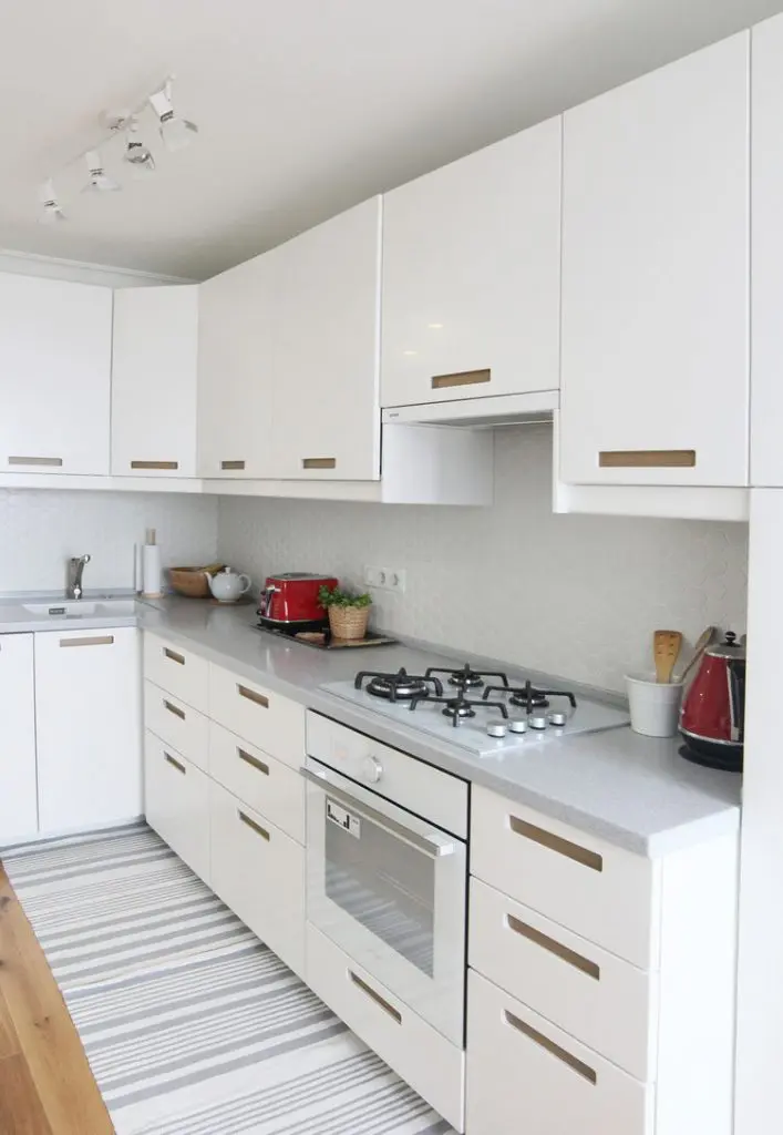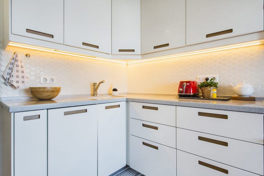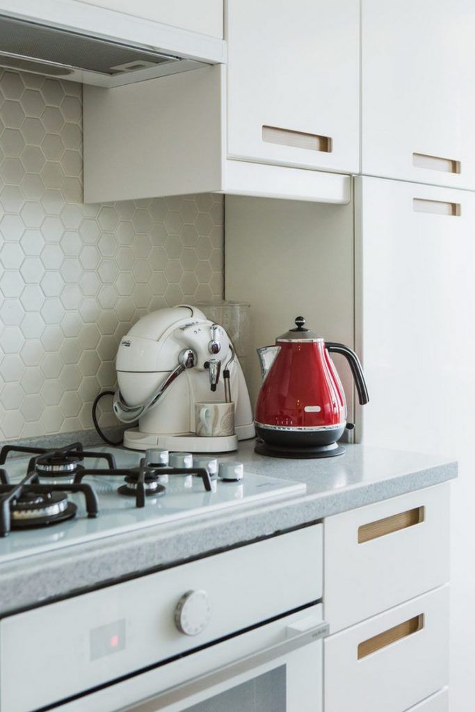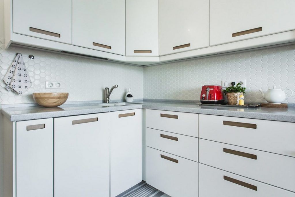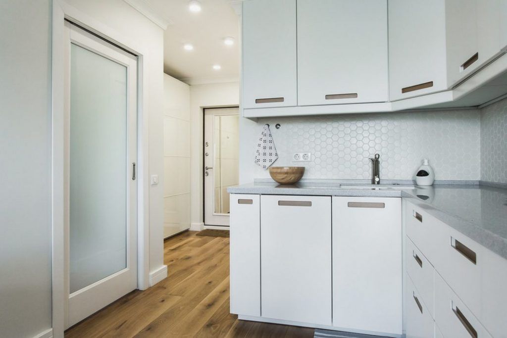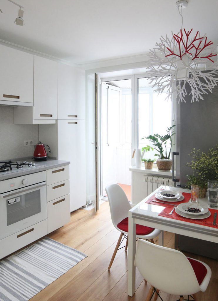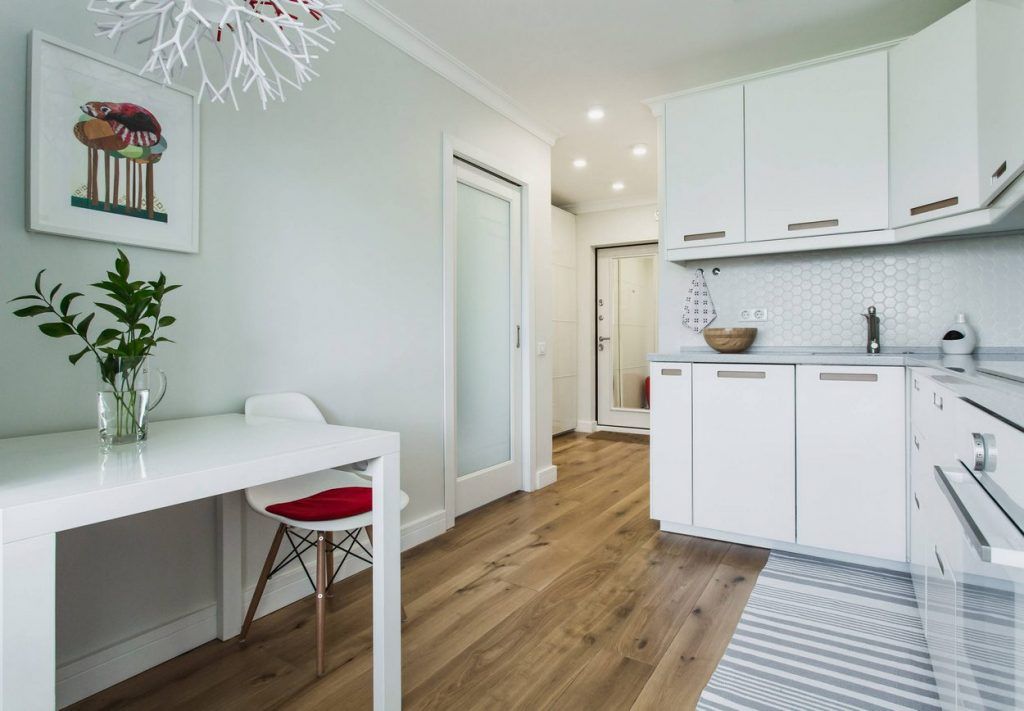 Bucataria comunica direct cu holul, fiind practic un open space, delimitat doar prin dispunerea mobilierului. A fost ales un model simplu, cu front alb pentru dulapuri. Electrocasniecele sunt incorporate (cu exceptia frigiderului), iar cele doua laturi ale bucatariei asigura o functionare optima a zonelor de lucru. Desi tot albe, placile mici hexagonale dintre corpurile de mobilier se integreaza placut in decor, efectul fiind de luminozitate sporita. Iesirea incaperii spre balcon ofera un plus de spatiu necesar.