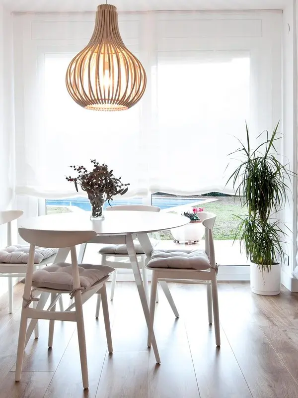 Ne place ca aceasta amenajare nu abunda in elemente obositoare. Mobilierul si decoratiunile se imbina armonios spre a descrie un decor confortabil si placut. 2 canapele, 2 masute, una asezata in lateralul canapelei, plante, o lampa impunatoare si o zona minimalist conturata cu televizor si un semineu ecologic. Zona de conversatie se deschide spre dining creand legatura aceea fireasca intre spatii.