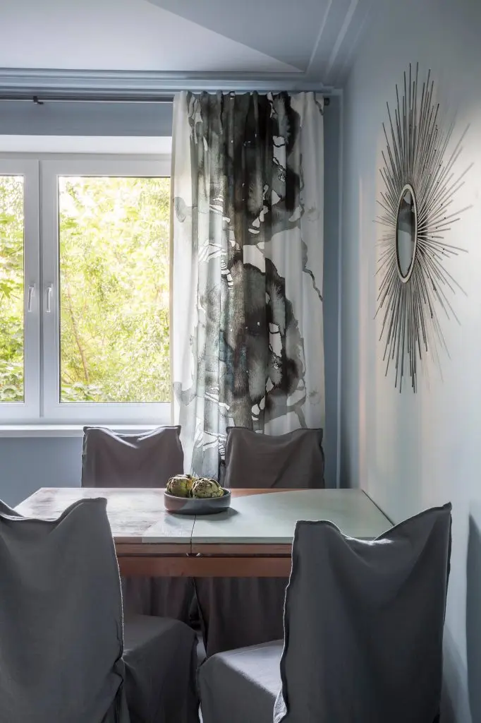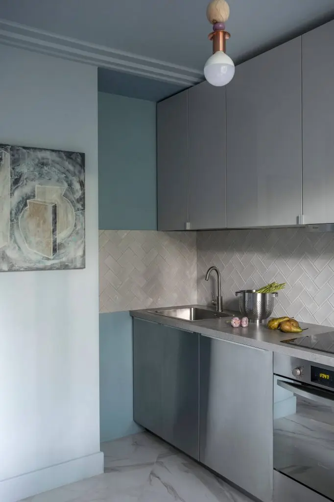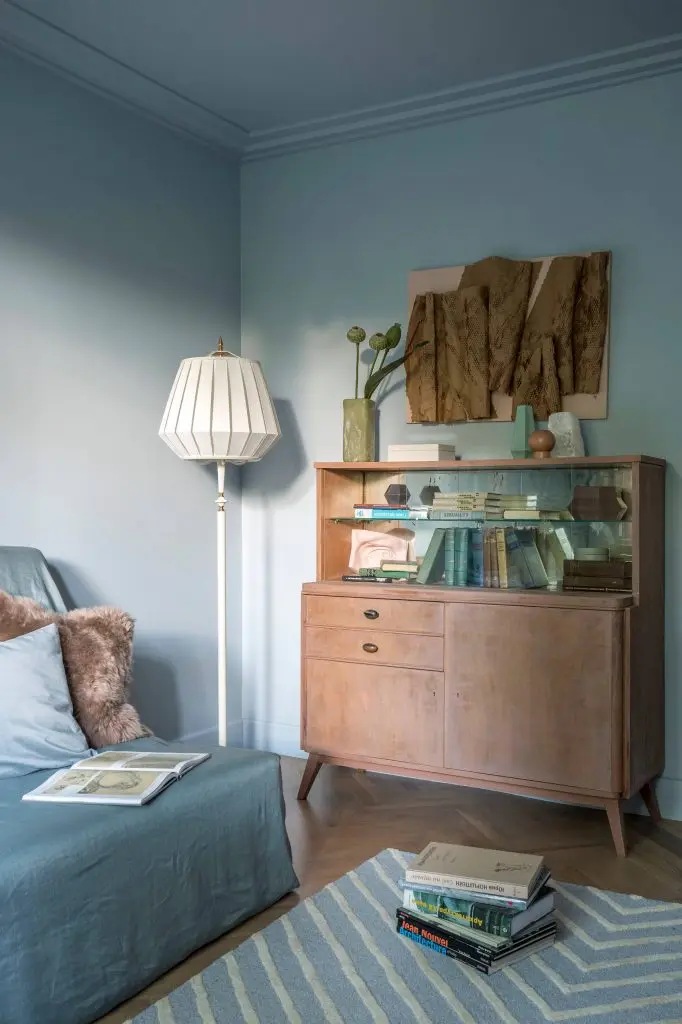 Spatiul este gandit sa fie cat mai luminos, de aceea designerul a folosit pentru pereti doua nuante de albastru, pe cea mai inchisa in partea de jos, iar pe cea mai deschisa in partea de sus si pe tavan. Un model geometric a fost creat prin vopsirea unui perete integral in nuanta mai inchisa si o portiune din tavan.