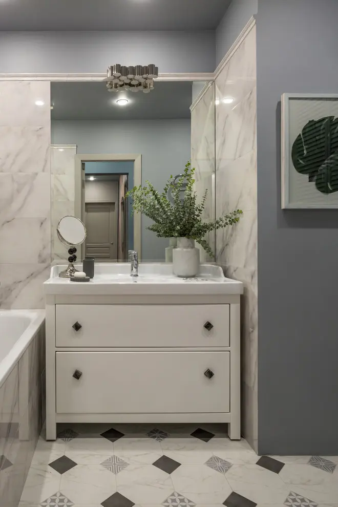 Baia nu este foarte generoasa, insa dispune de spatii de depozitare sub lavoar. Albastrul si placile marmorate de faianta impreuna cu patternurile de pe podea ofera un ambient placut.