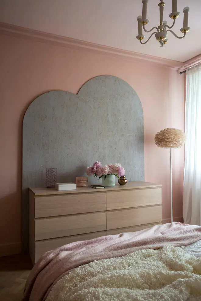 Spatiul din dormitor nu este foarte generos, de aceea zona de depozitare a fost mutata intr-un dressing walk-in, pastrand in dormitor doar o comoda. Designerul a ales sa scoata in evidenta zona patului printr-un tapet discret atat prin imprimeu, cat si prin culoare. Cromatic, predomina nuantele cuminti de roz, alb si crem redate in textilele de pe pat, la nivelul covorului si al draperiilor.