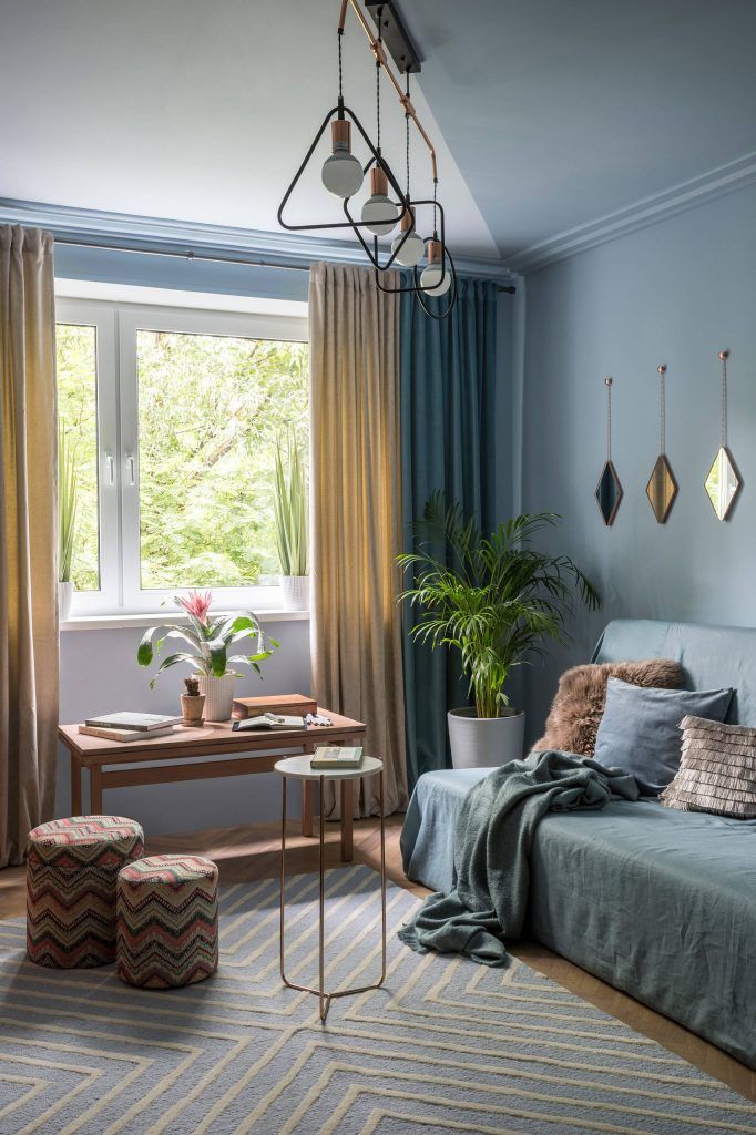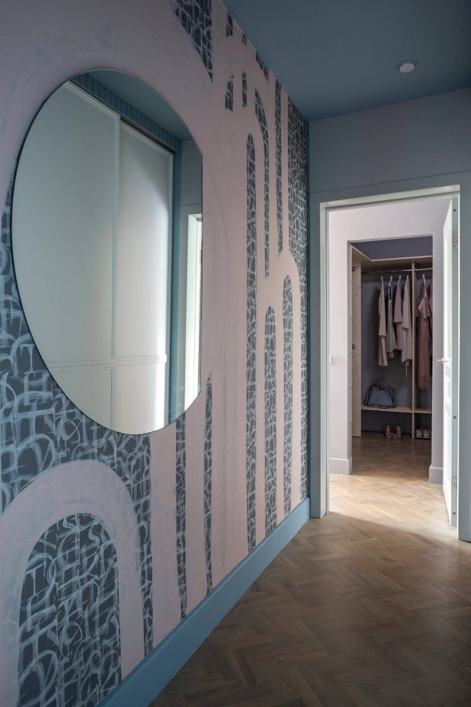 Spatiul este gandit sa fie cat mai luminos, de aceea designerul a folosit pentru pereti doua nuante de albastru, pe cea mai inchisa in partea de jos, iar pe cea mai deschisa in partea de sus si pe tavan. Un model geometric a fost creat prin vopsirea unui perete integral in nuanta mai inchisa si o portiune din tavan.