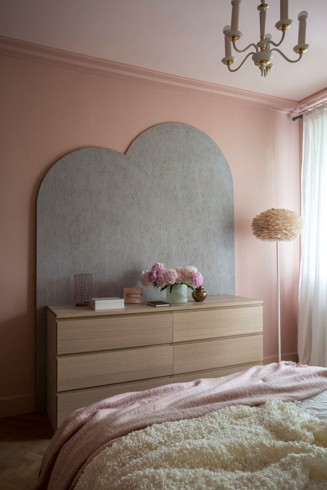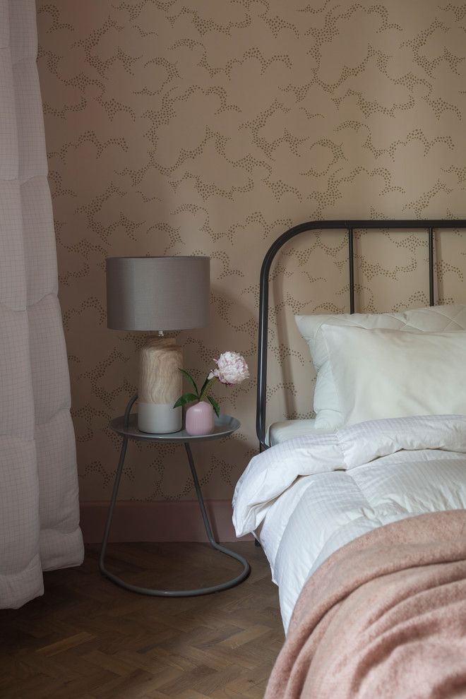 Spatiul din dormitor nu este foarte generos, de aceea zona de depozitare a fost mutata intr-un dressing walk-in, pastrand in dormitor doar o comoda. Designerul a ales sa scoata in evidenta zona patului printr-un tapet discret atat prin imprimeu, cat si prin culoare. Cromatic, predomina nuantele cuminti de roz, alb si crem redate in textilele de pe pat, la nivelul covorului si al draperiilor.