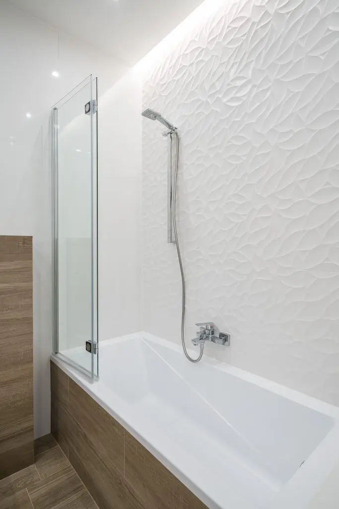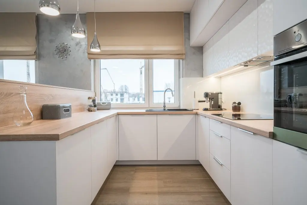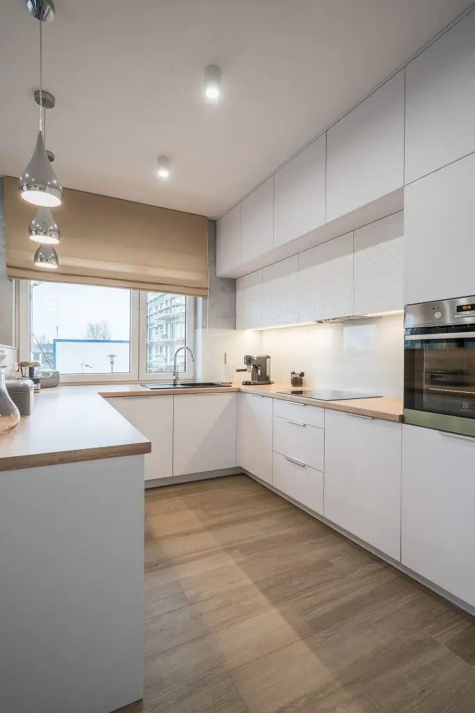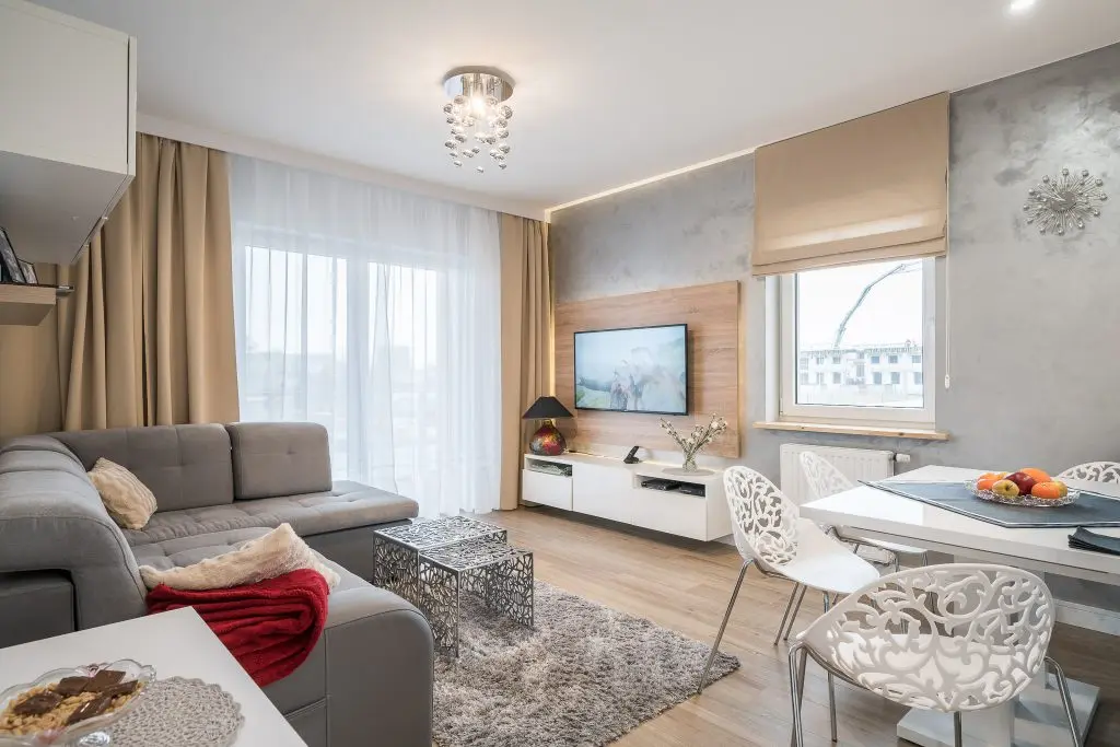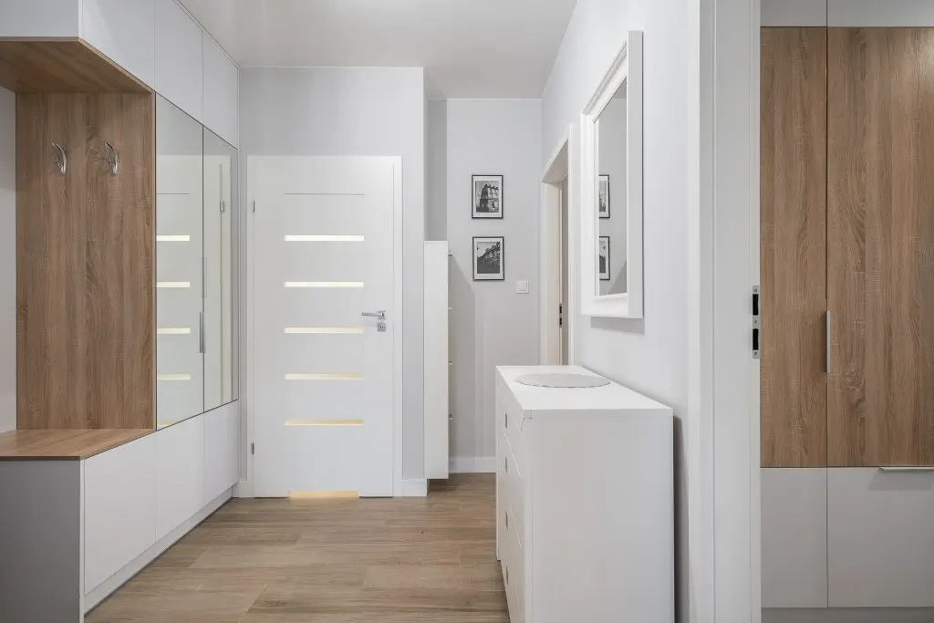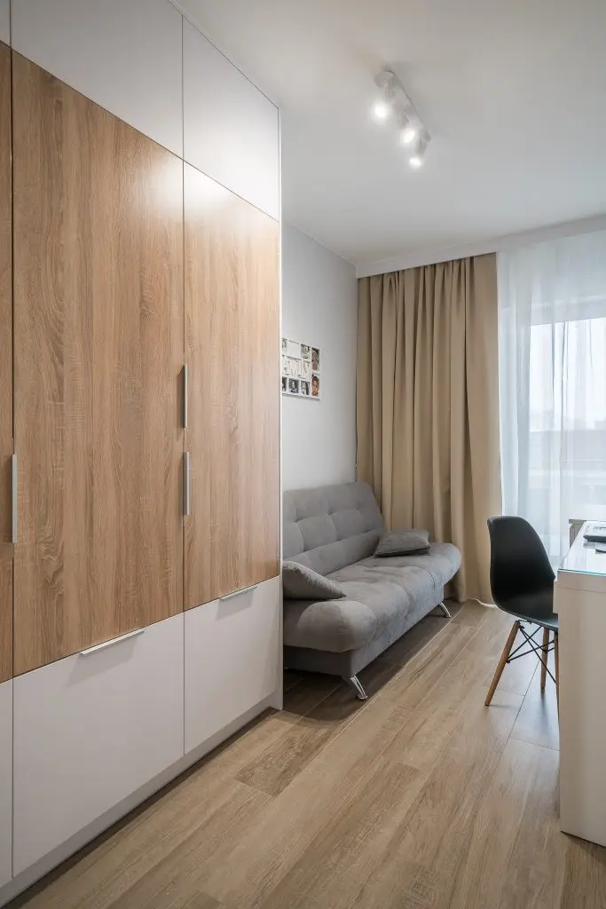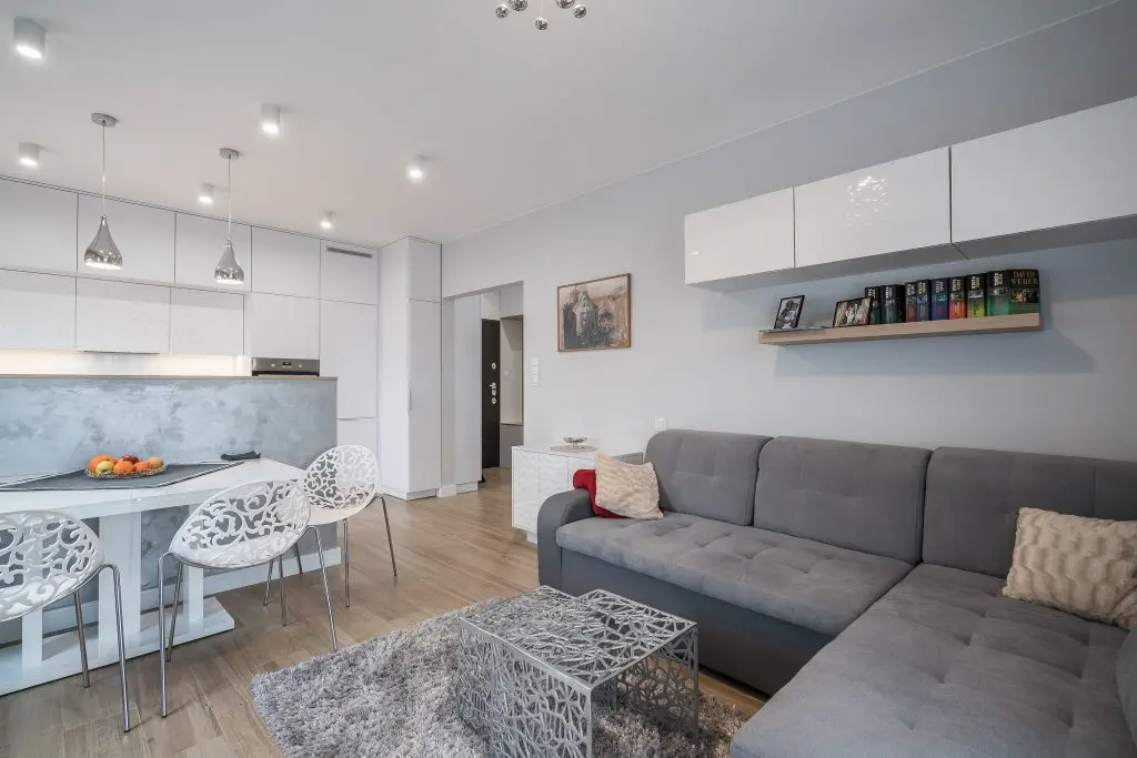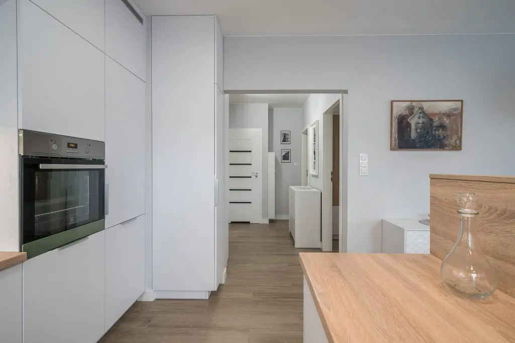 Piesele de mobilier pastreaza linia simpla si aerisita specfica apartamentelor moderne: culoare alba cu insertii de lemn.