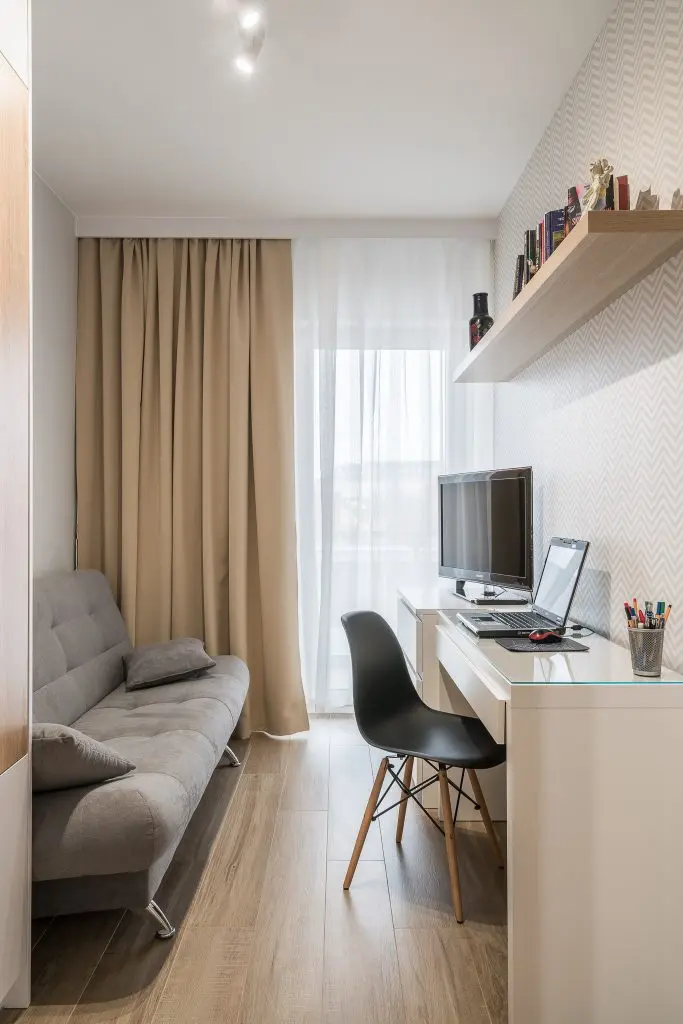 Camera destinata lucrului acasa si studiului pastreaza echilibrul perfect intre functionalitate si relaxare, datorata canapelei care poate deveni cu usurinta un spatiu destinat conversatiei sau unul pentru citit.