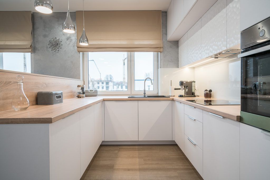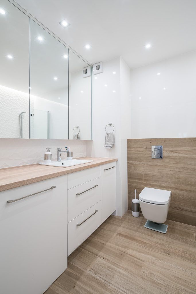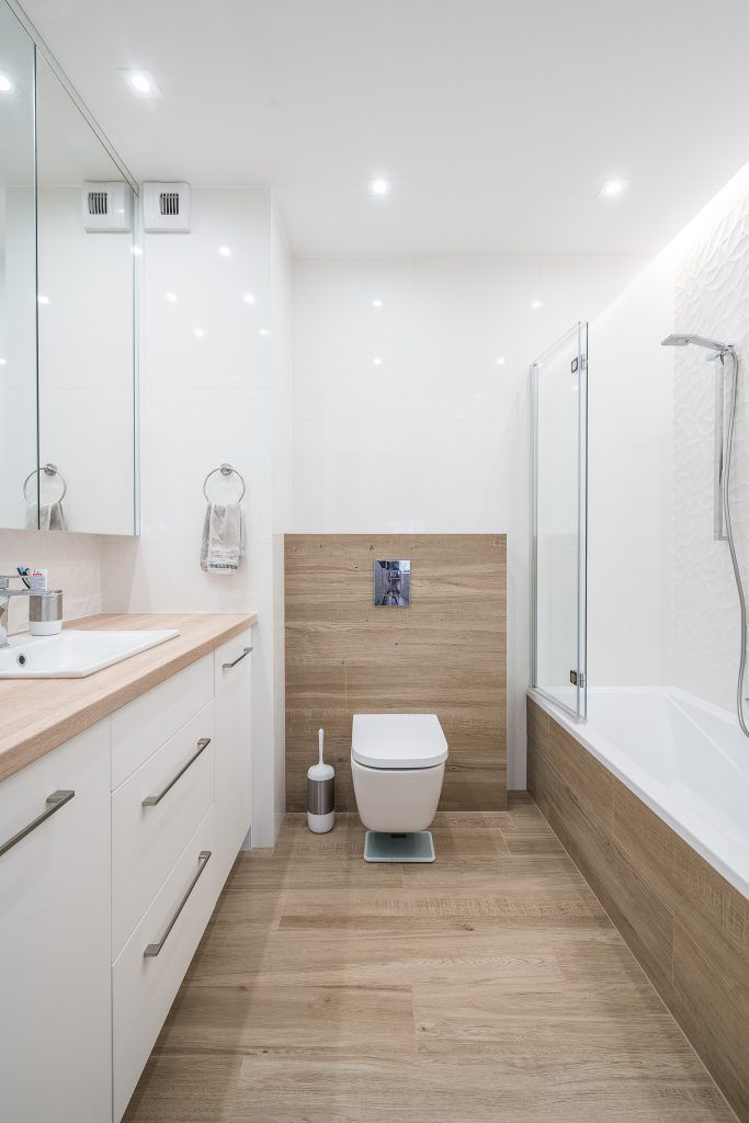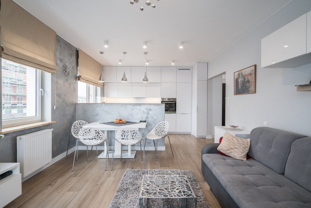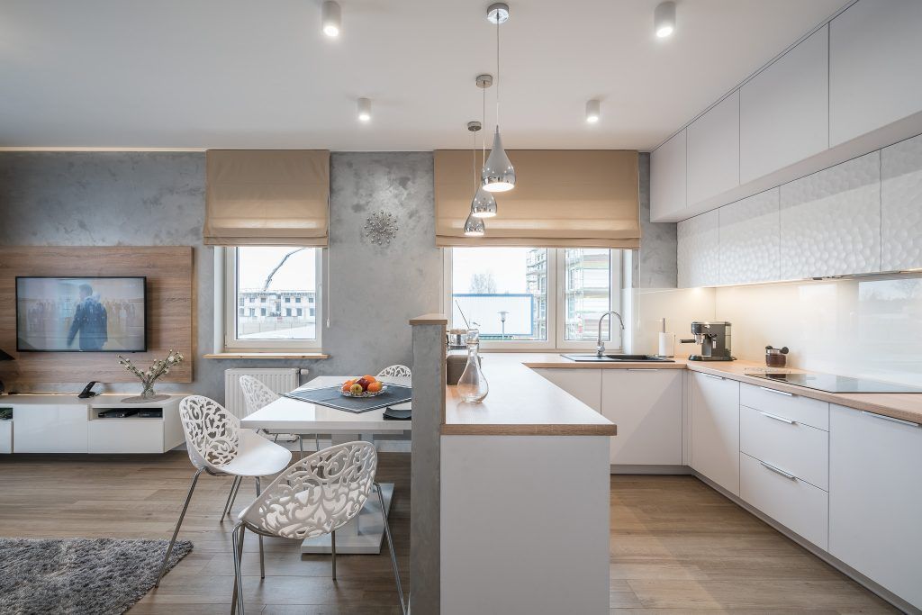 Piesele de mobilier pastreaza linia simpla si aerisita specfica apartamentelor moderne: culoare alba cu insertii de lemn.
