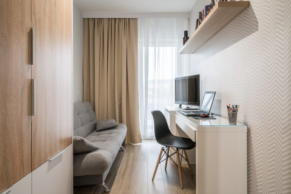 Camera destinata lucrului acasa si studiului pastreaza echilibrul perfect intre functionalitate si relaxare, datorata canapelei care poate deveni cu usurinta un spatiu destinat conversatiei sau unul pentru citit.