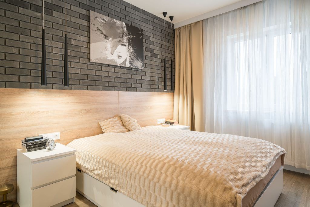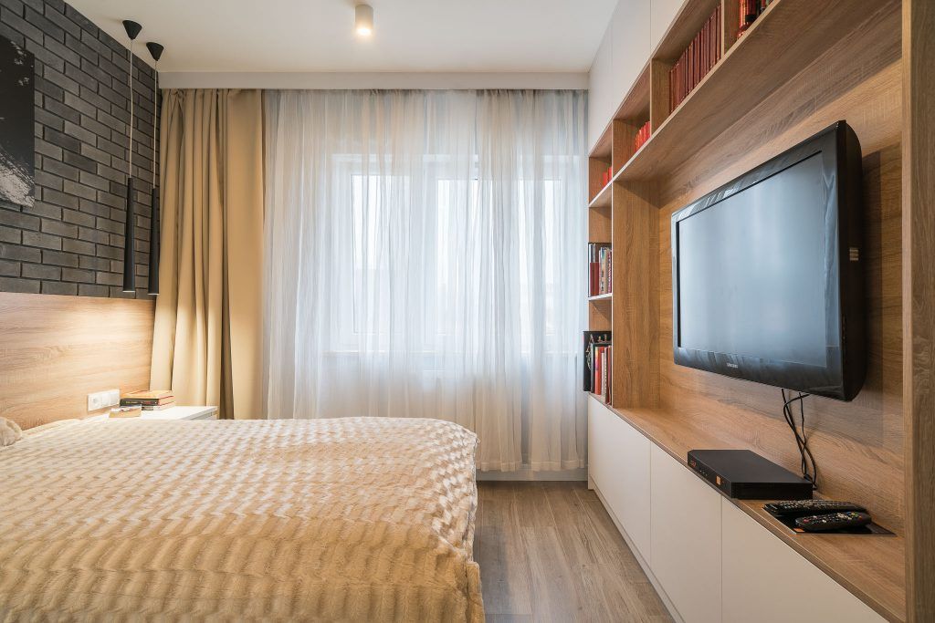 Dormitorul este ocupat in cea mai mare parte de patul matrimonial, iar Karoline a reusit sa integreze aici si un dulap pentru haine incastrat alaturi de alte spatii pentru depozitare si o zona pentru T V.