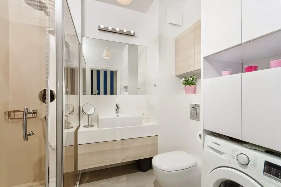 Baia reuseste sa fie functionala si confortabila pentru un cuplu de tineri, in ciuda dimensiunilor reduse. Dusul incorporat in perete, chiuveta care ocupa o buna parte a baii, suficientele spatii de depozitare si masina de spalat o fac perfecta pentru acest tip de apartament.