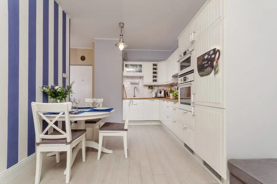 Zona de bucatarie se prelungeste cu cea a dining-ului. Acestea se completeaza prin utilizarea aceleiasi culori albe din mobilierul de bucatarie pentru masa rotunda si cele patru scaune. Tiparul romantic este spart de peretele opus bucatariei care a fost decorat cu un tapet strident in dungi verticale albe si albastre.