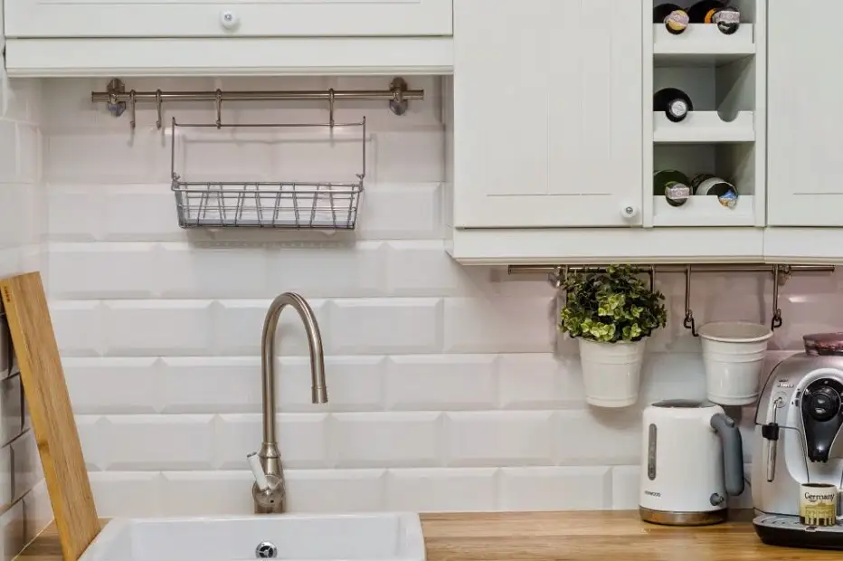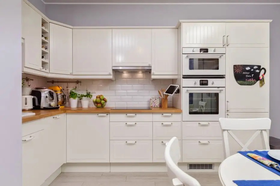 Mobilierul de culoare alba din bucatarie are un design simplu in forma de L si ocupa cea mai mare parte a unui perete cu scopul de a economisi cat mai mult spatiu. Frigiderul a fost perfect integrat in structura mobilierului.