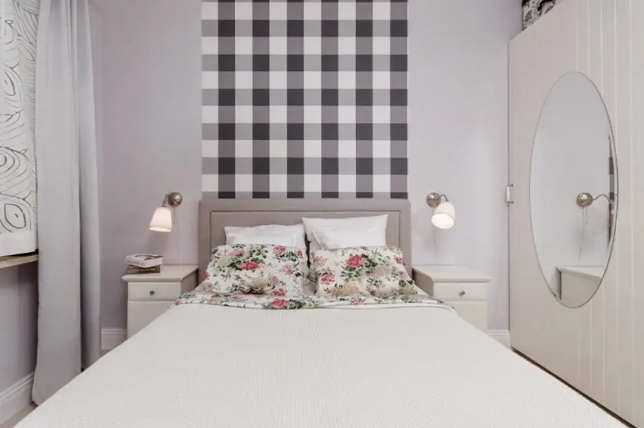 Dormitorul este amenajat intr-un stil feminin, placut estetic. Desi este mic, cuplul se bucura de toate elementele necesare acestei incaperi: un pat matrimonial de mici dimensiuni, doua noptiere albe, un dulap mare si o comoda alungita. In simplitatea decorului, ies in evidenta lampa rotunda cu diferite texturi si tapetul decorat in carouri albe si gri.