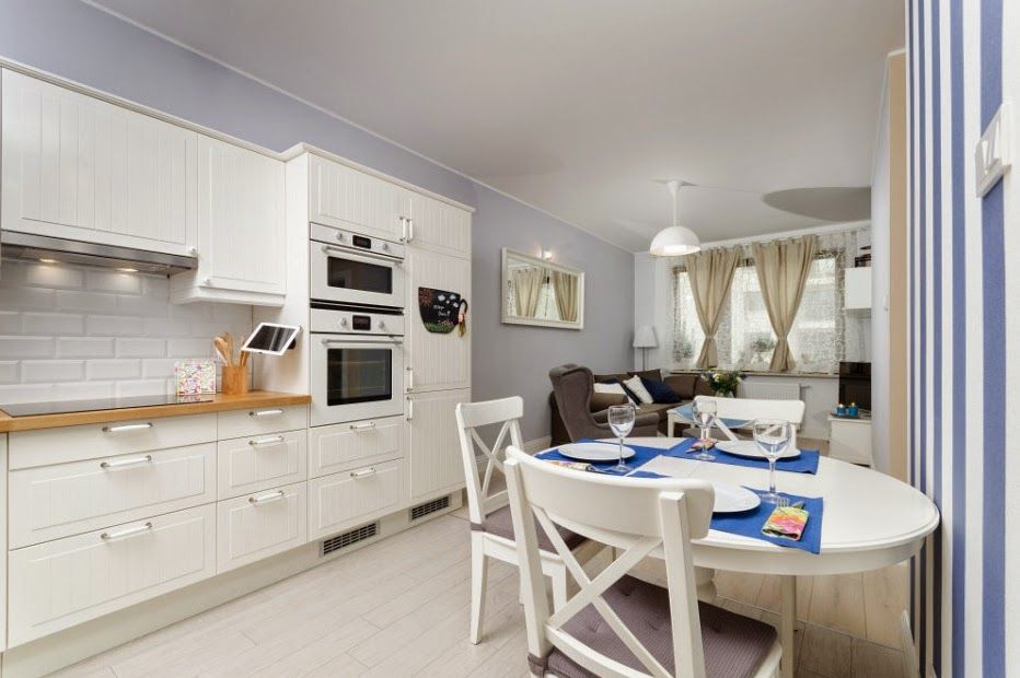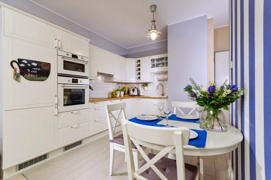 Zona de bucatarie se prelungeste cu cea a dining-ului. Acestea se completeaza prin utilizarea aceleiasi culori albe din mobilierul de bucatarie pentru masa rotunda si cele patru scaune. Tiparul romantic este spart de peretele opus bucatariei care a fost decorat cu un tapet strident in dungi verticale albe si albastre.