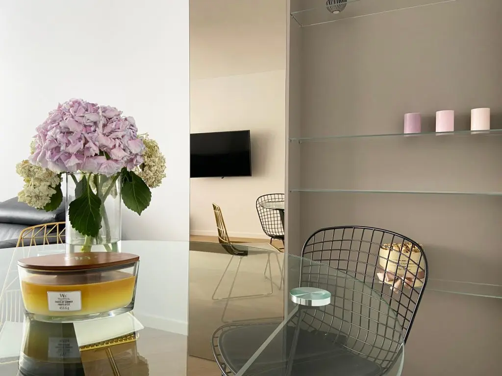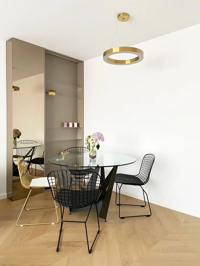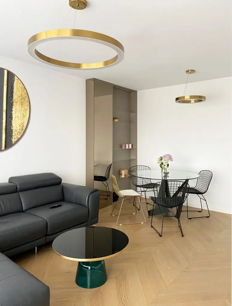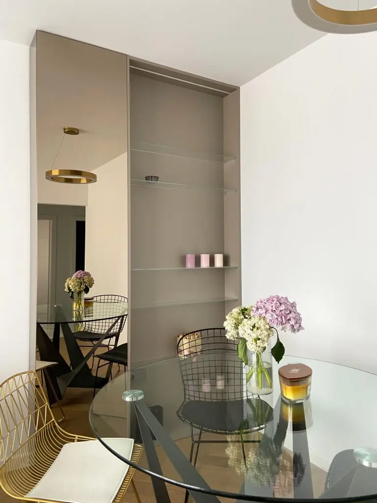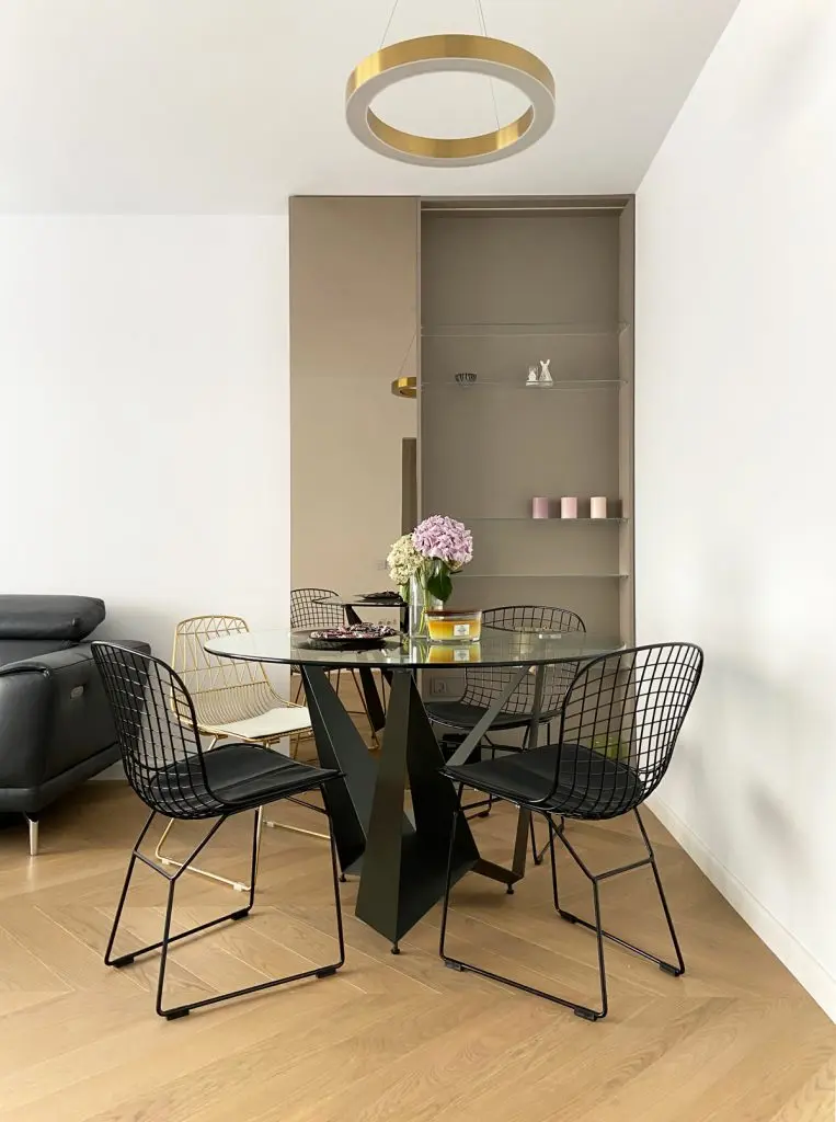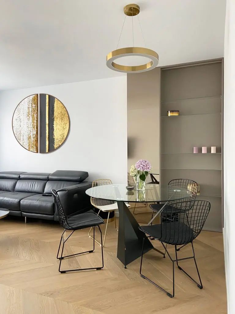 Elementele aurii confera un plus de feminitate intregii amenajari; “masa de dining cu blatul rotund din sticla echilibreaza liniile drepte ale corpului care mascheaza stalpul.”