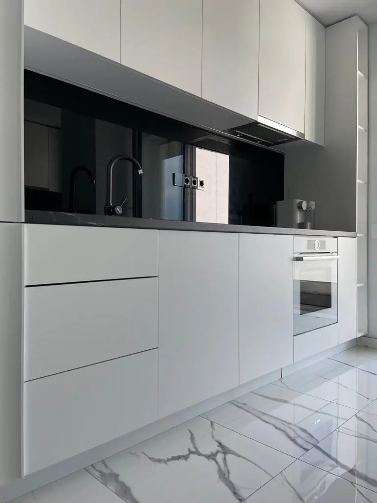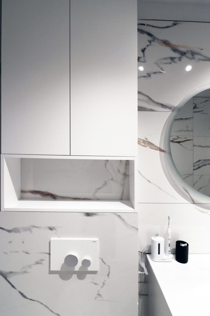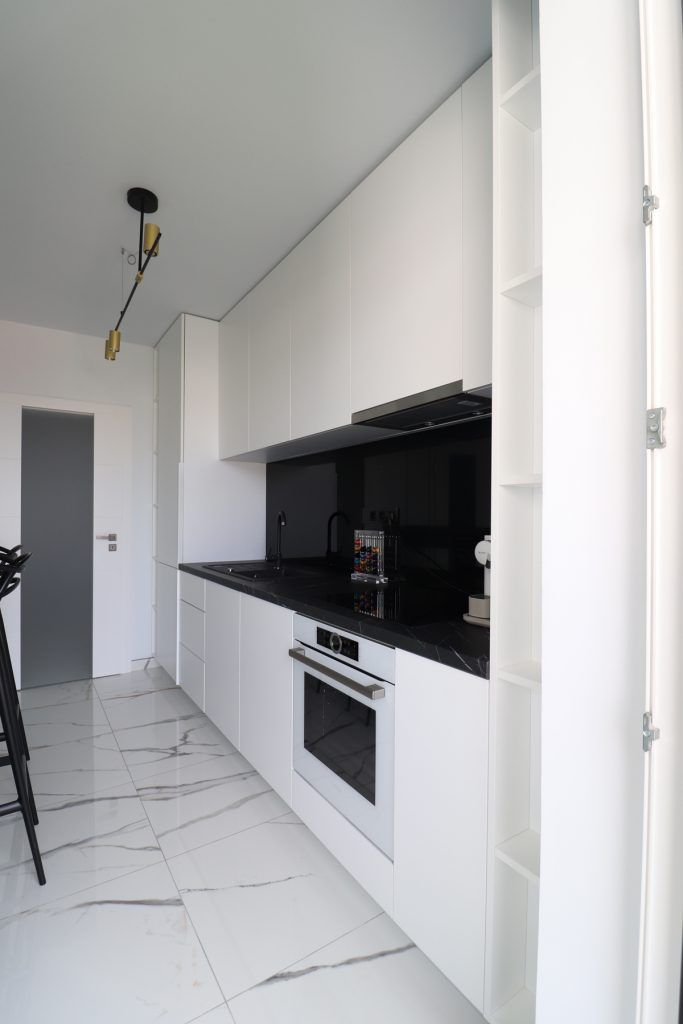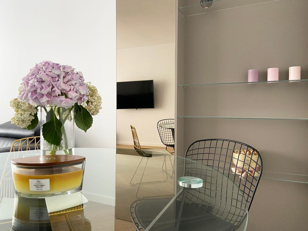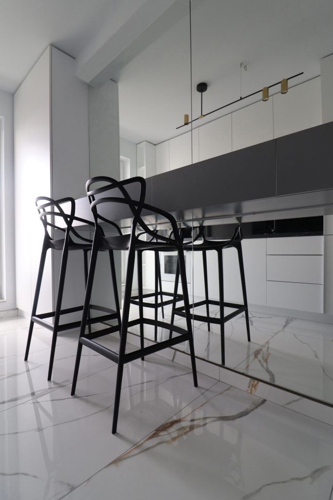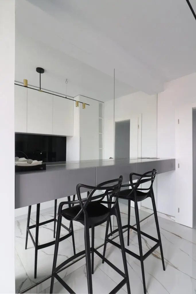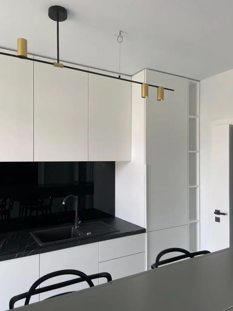 Designerii implicati in aceasta amenajare ne-au povestit ca desi locuinta are o suprafata generoasa pentru un apartament de doua camere, bucataria are dimensiuni reduse, “motiv pentru care s-a insistat foarte mult pe maximizarea functionala a acesteia, prin intermediul corpurilor coloana care incadreaza zona blatului de lucru, si maximizarea vizuala care s-a realizat cu ajutorul placarilor de oglinda.”