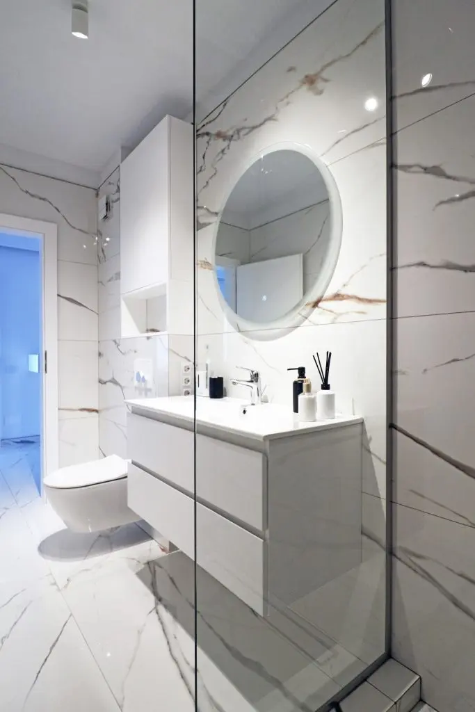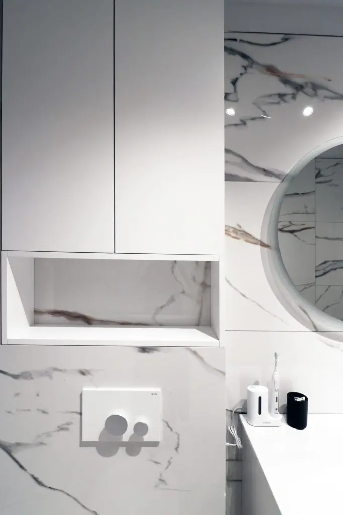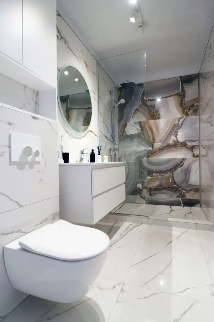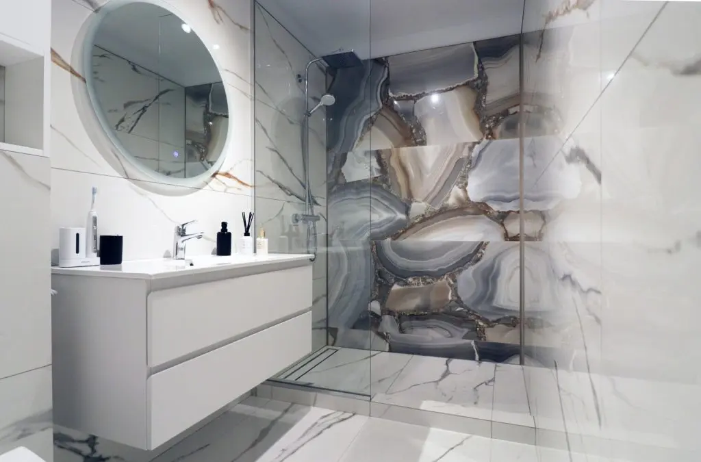 Baia este placata integral cu piatra , elementul-vedeta fiind peretele cu dusul walk-in , din piatra cu aspect de agat. Mobilierul minimalist completeaza si aici atmosfera eleganta.