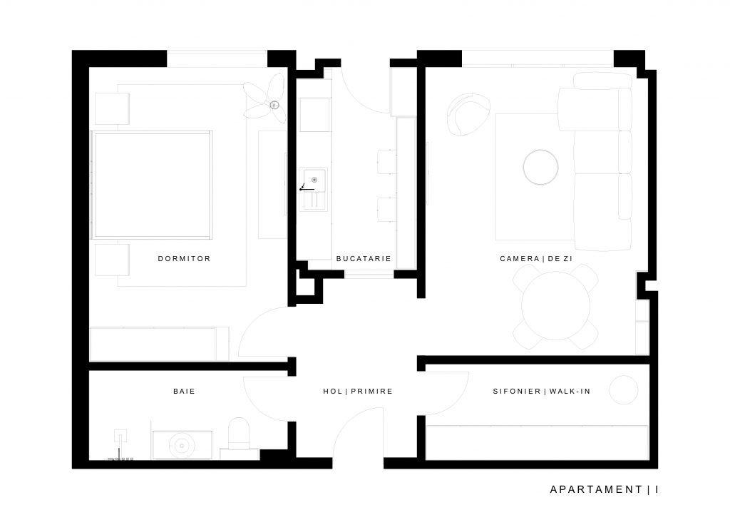 Deschide GaleriaApartamentul are o compartimentare functionala,cu proportii echilibrate intre spatii. Din holul de acces se intra in baie si dormitor pe partea stanga, bucataria dreptunghiulara este amplasata in fata iar zona de zi si dressingul se afla in dreapta intrarii.