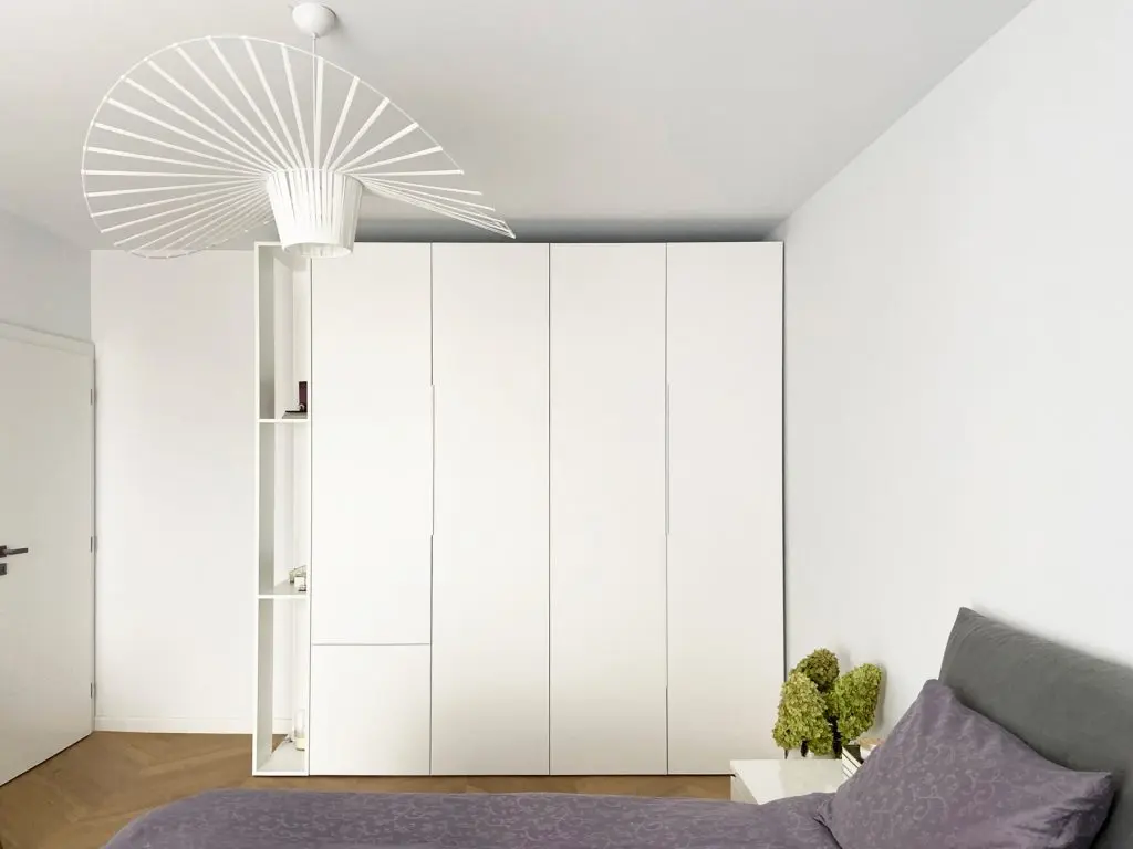 In viziunea echipei de proiectrae, dormitorul nu trebuie sa fie aglomerat in detalii sau decoratiuni pentru a garanta relaxarea necesara. Astfel, au optat pentru folosirea intensa a albului care sa confere luminozitate spatiului.