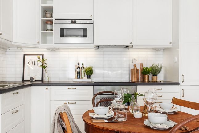 Spatiul bucatariei mizeaza pe acelasi minimalism eficient, corpurile oferind spatiu suficient pentru depozitare. Alegand sa incastreze electrocasnicele in interiorul mobilierului, designerul a realizat o imagine compacta a bucatariei care astfel se integreaza subtil in ansamblul amenajarii zonei de zi. Masa cu scaunele au un aer usor vintage, aducand o aura aparte acestui spatiu. Albul este predominant si in acest sector fiind bine pus in valoare si de corpurile de iluminat tip spoturi.