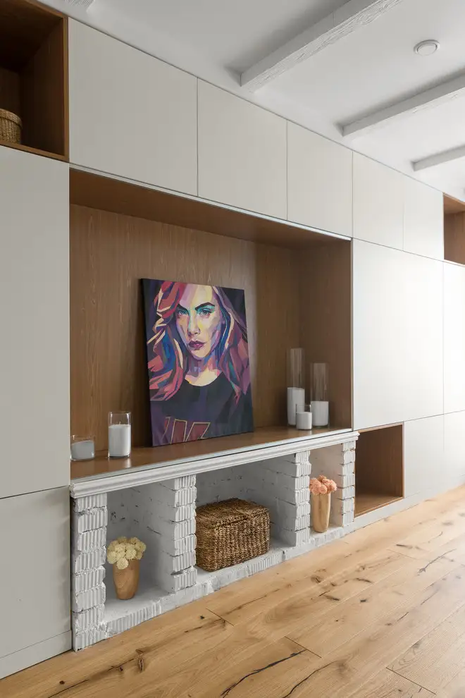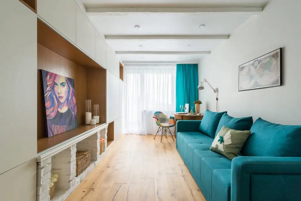 Living-ul devine pata de culoare a amenajarii si pune in evidenta turcoaz-ul prin canapea, scaun de birou si accesorii textile. Mobilerul continua linia celui din bucatarie in aceeasi maniera minimalista si pozitioneaza central un tablou pictat modern.