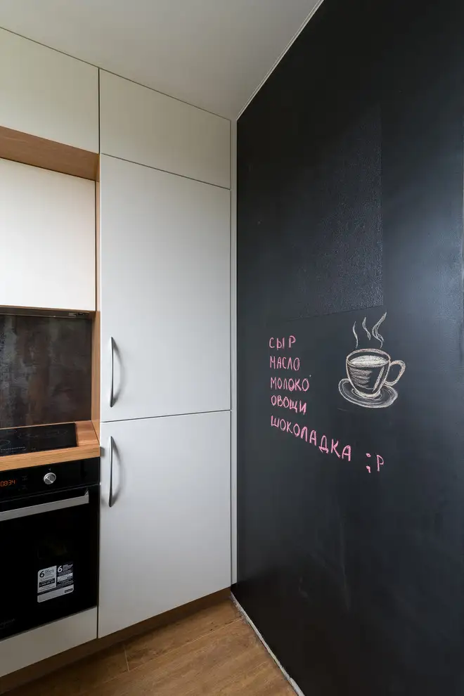 Elementul care atrage in mod inevitabil atentia este peretele al carei vopsea ne permite sa lasam o amprenta personala pe suprafata acestuia. Pentru ca din punct de vedere vizual camera se compune din doua non-culori, accesorizarea cromatica este la indemana si astfel putem observa asortarea discreta a nuantelor de orange si verde natural.