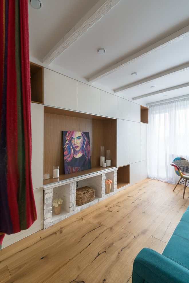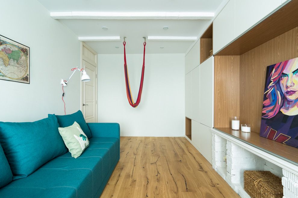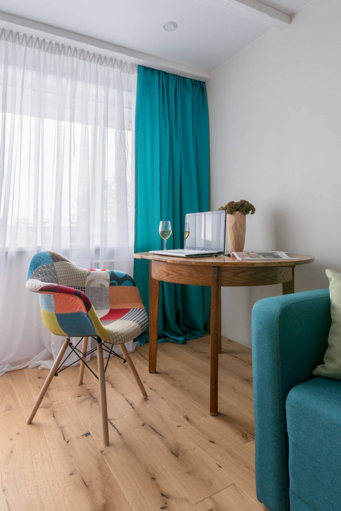 Living-ul devine pata de culoare a amenajarii si pune in evidenta turcoaz-ul prin canapea, scaun de birou si accesorii textile. Mobilerul continua linia celui din bucatarie in aceeasi maniera minimalista si pozitioneaza central un tablou pictat modern.