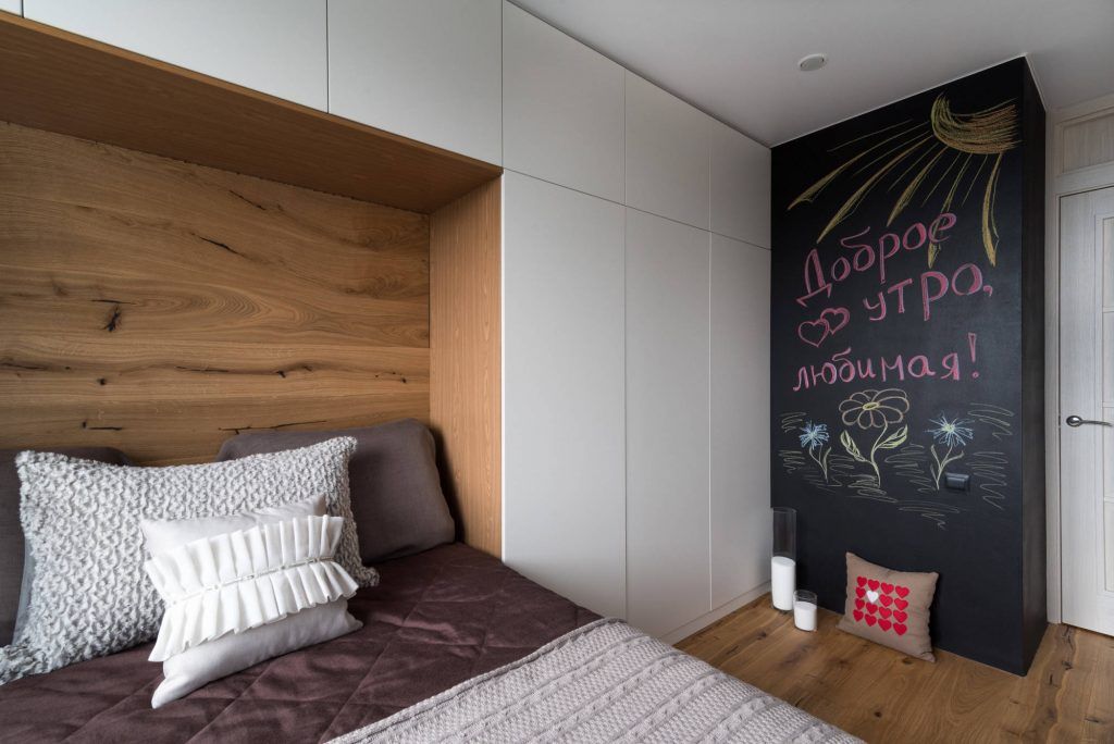 Dormitorul matrimonial creeaza o atmosfera romantica pastrand in aceeasi masura design-ul celorlalte incaperi. Vizual, cromatica se calmeaza si se pune accent pe nuante de beige, crem si maro. Singurul element care iese din tipare este peretele identic cu cel din bucatarie, care permite expunerea imaginatiei in cel mai creativ mod.