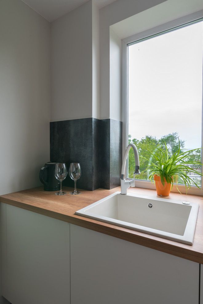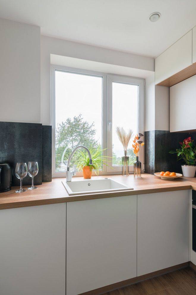 Deschide GaleriaBucataria monocromatica scoate in evidenta elementul natural reprezentat de lemn, pe care il regasim in compozitia mobilierului si a parchetului. Pentru ca spatiul este restrans, mobilierul are o linie simpla si minimalista ce incastreaza electrocasnicele intr-o maniera subtila.