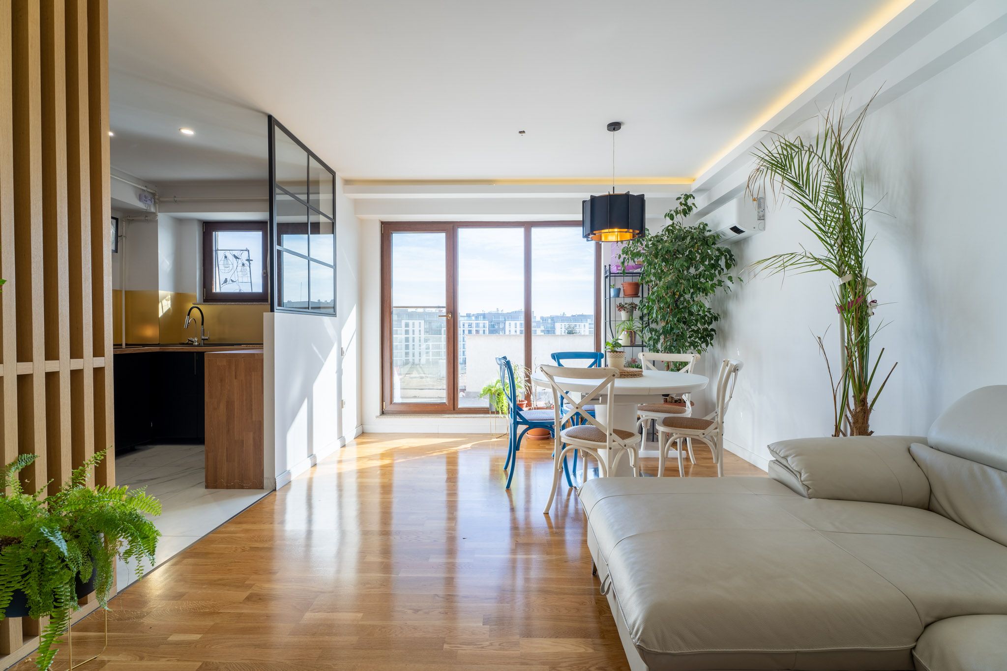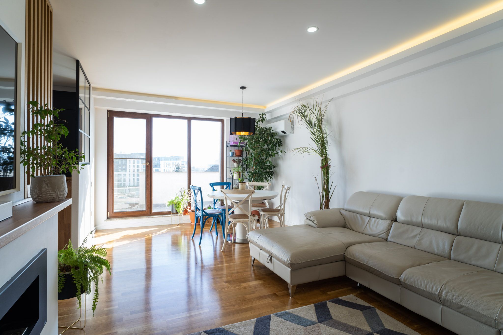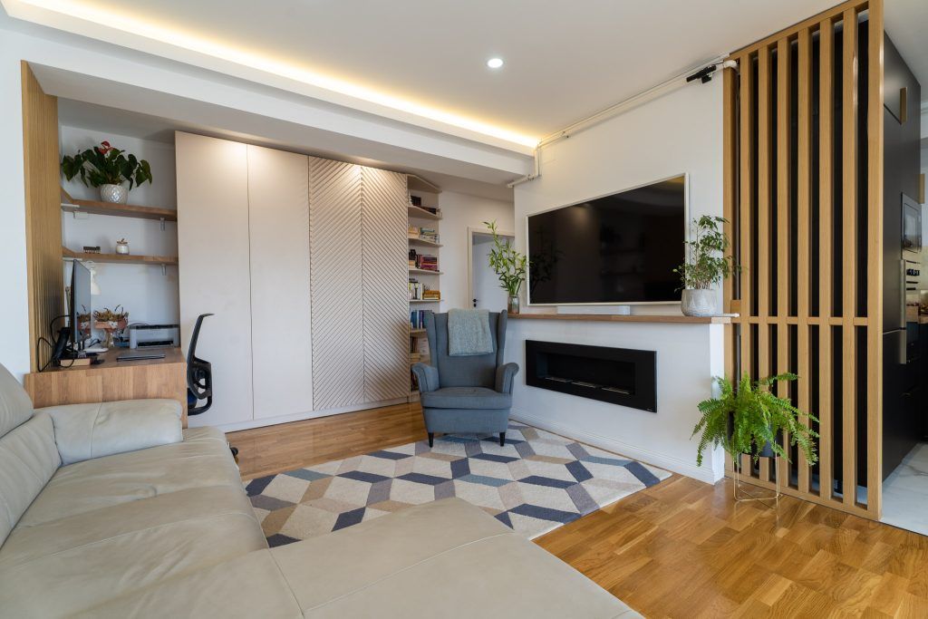 Un mare avantaj al acestui apartament este faptul ca beneficiaza de multa lumina naturala, livingul avand si iesire pe terasa. Pe timpul serii, iluminatul artificial compenseaza prin lumina generala creata de spoturi si sublinierea anumitor zone prin iluminat local si ambiental.