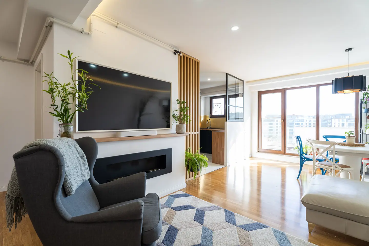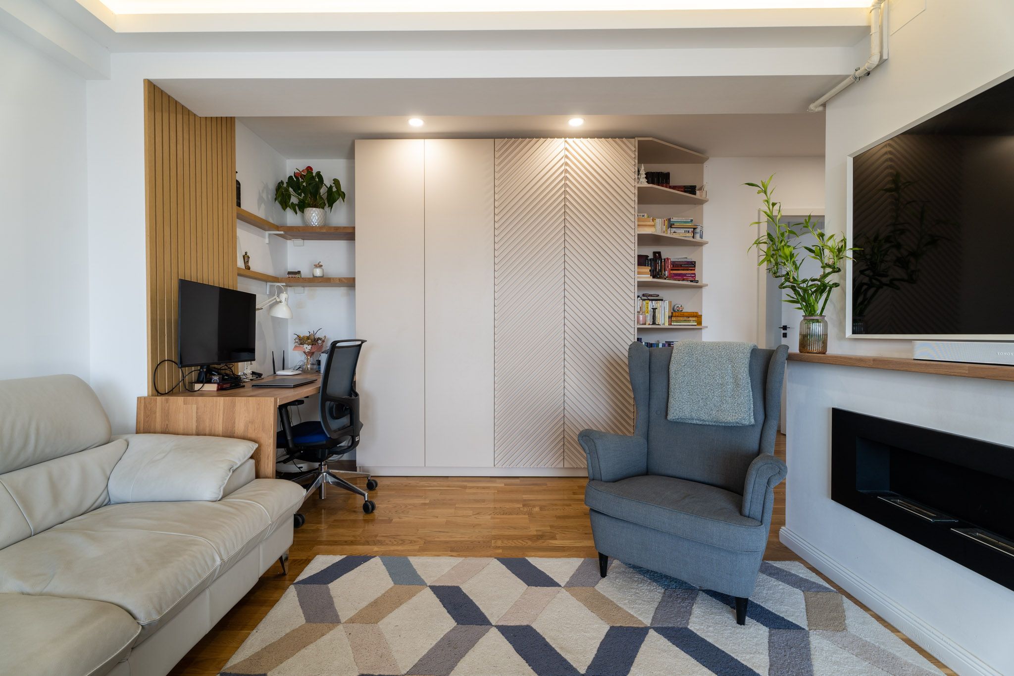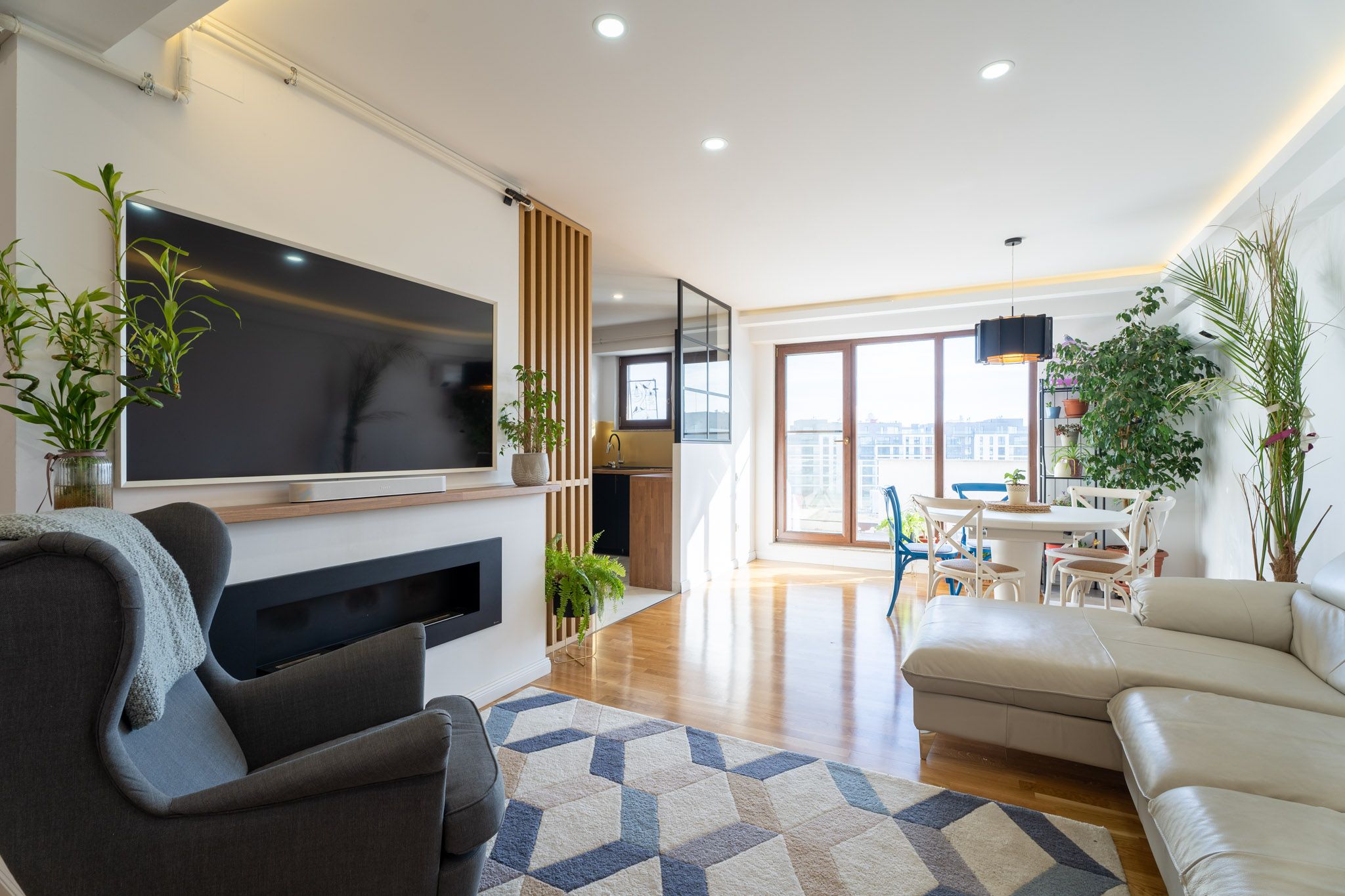 Un mare avantaj al acestui apartament este faptul ca beneficiaza de multa lumina naturala, livingul avand si iesire pe terasa. Pe timpul serii, iluminatul artificial compenseaza prin lumina generala creata de spoturi si sublinierea anumitor zone prin iluminat local si ambiental.