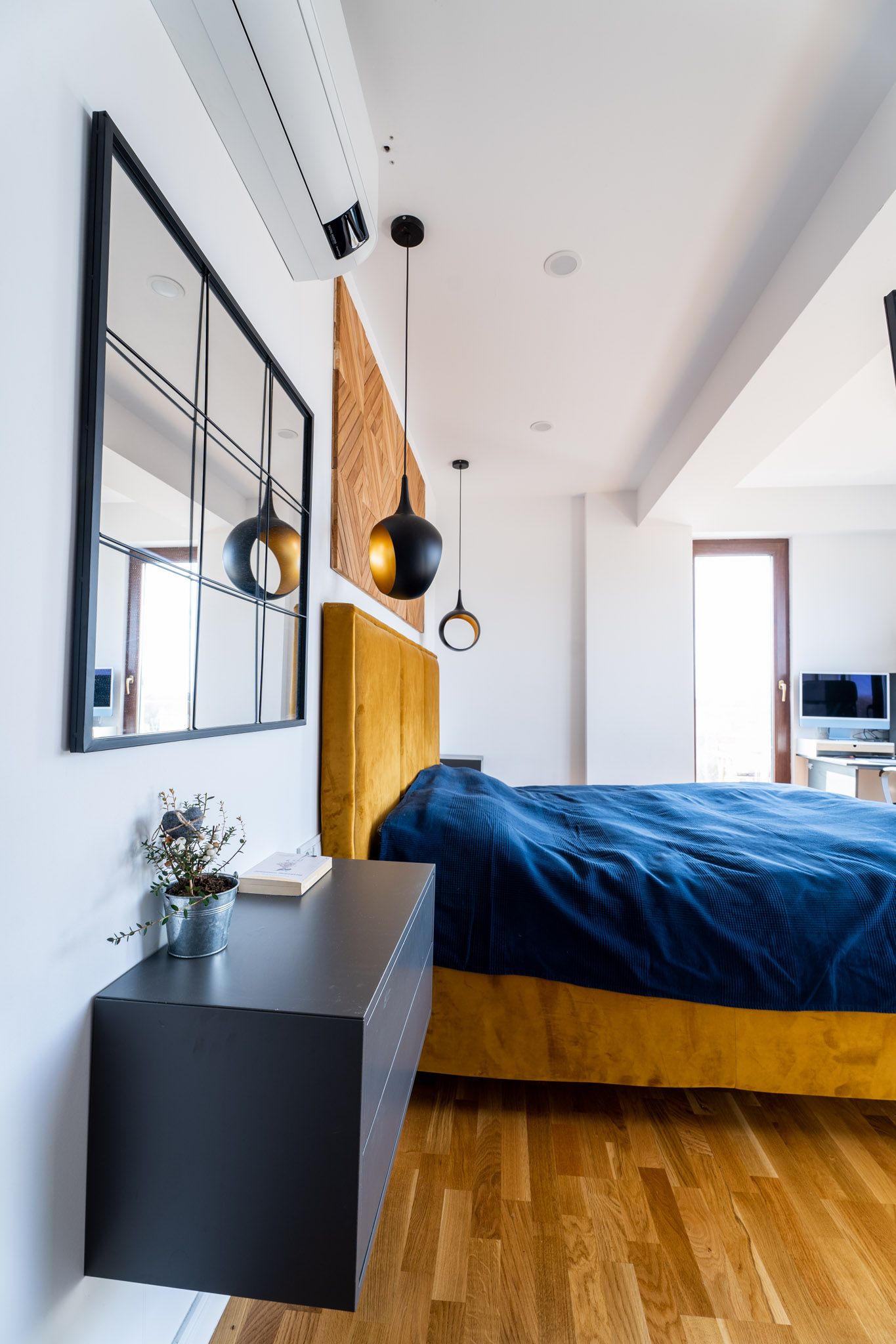 In amenajarea dormitorului a fost continuata linia stilistica moderna, cu influente industriale din intreaga locuinta.