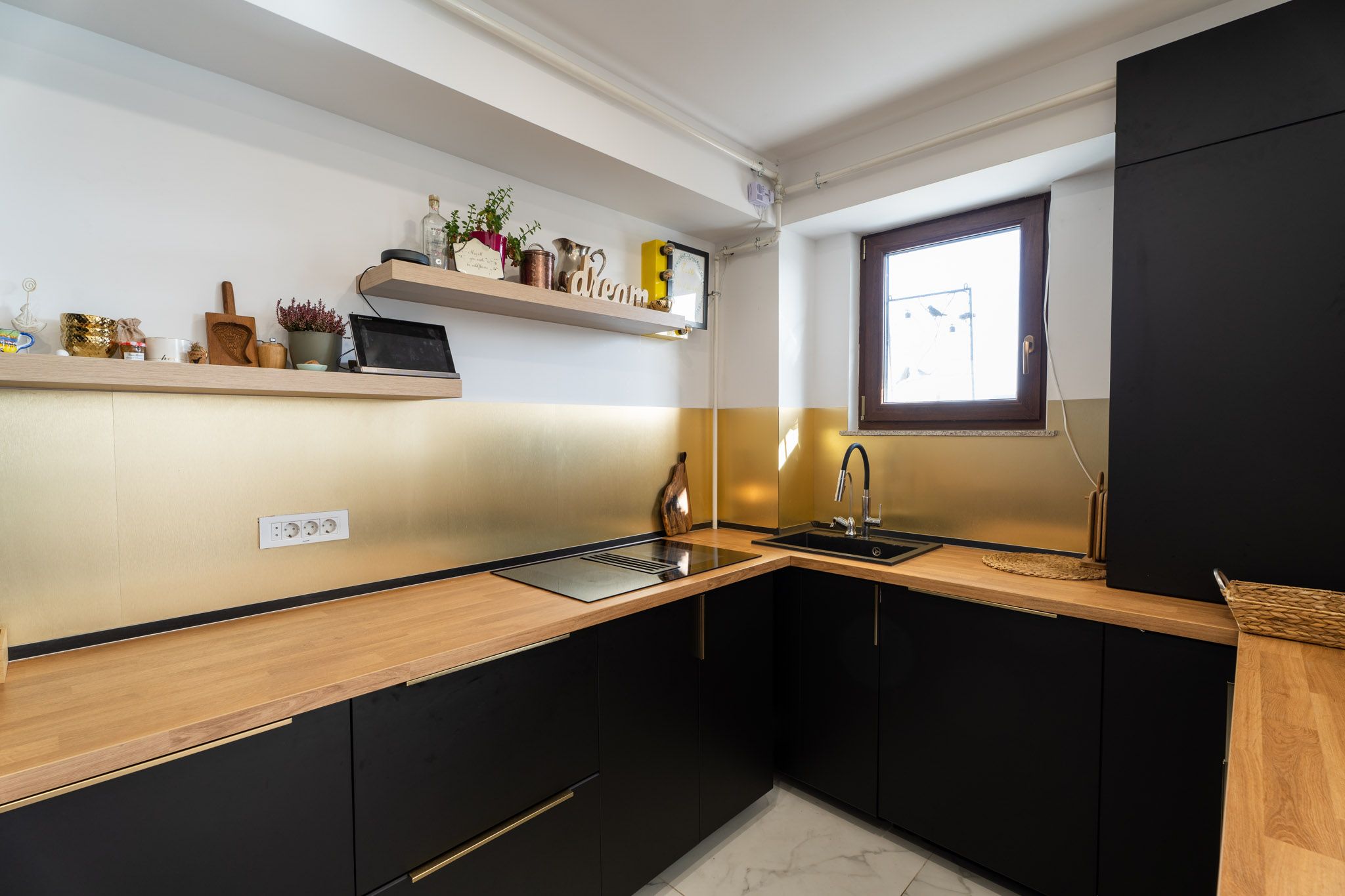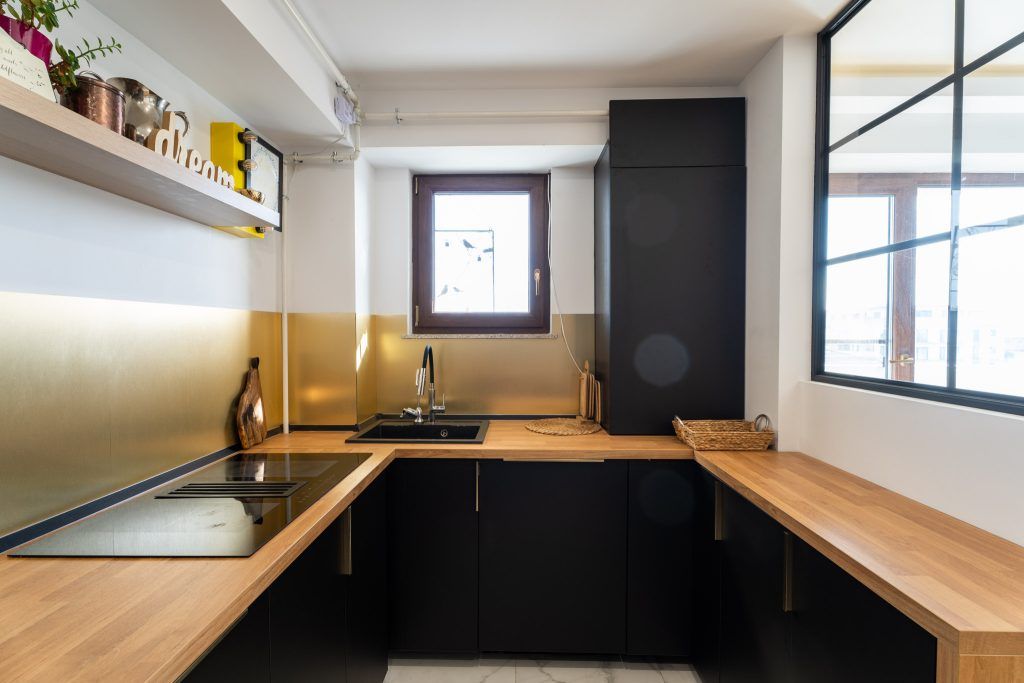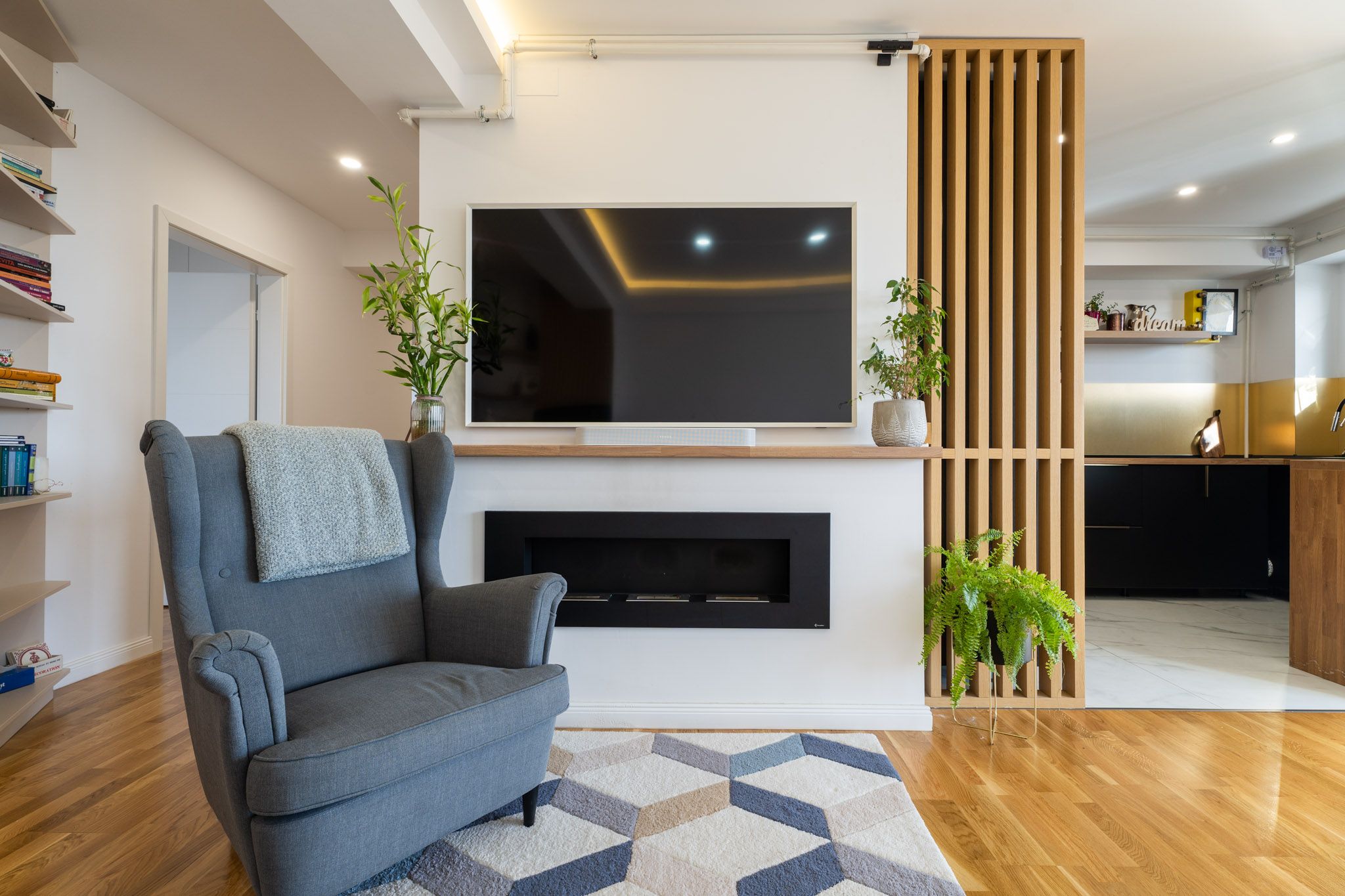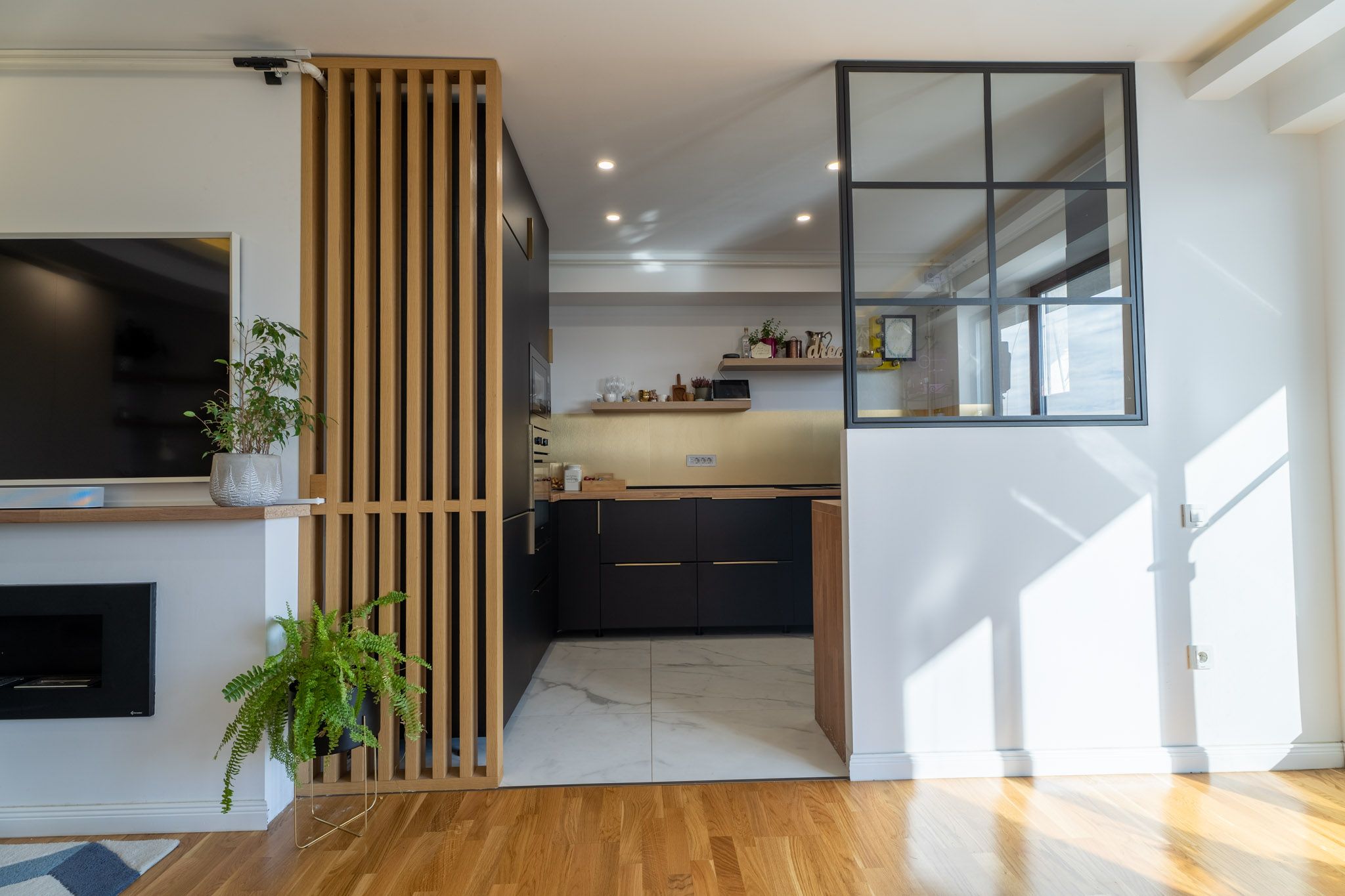 “Bucataria este separata vizual de living atat printr-o pardoseala diferita, cat si prin niste lamele furniruite cu lemn si un panou fix de sticla transparenta, cu structura metalica. Pentru ca apartamentul are incalzire in pardoseala, lamelele separatoare au fost lipite la partea de jos si prinse mecanic doar in perete si plafon.”
