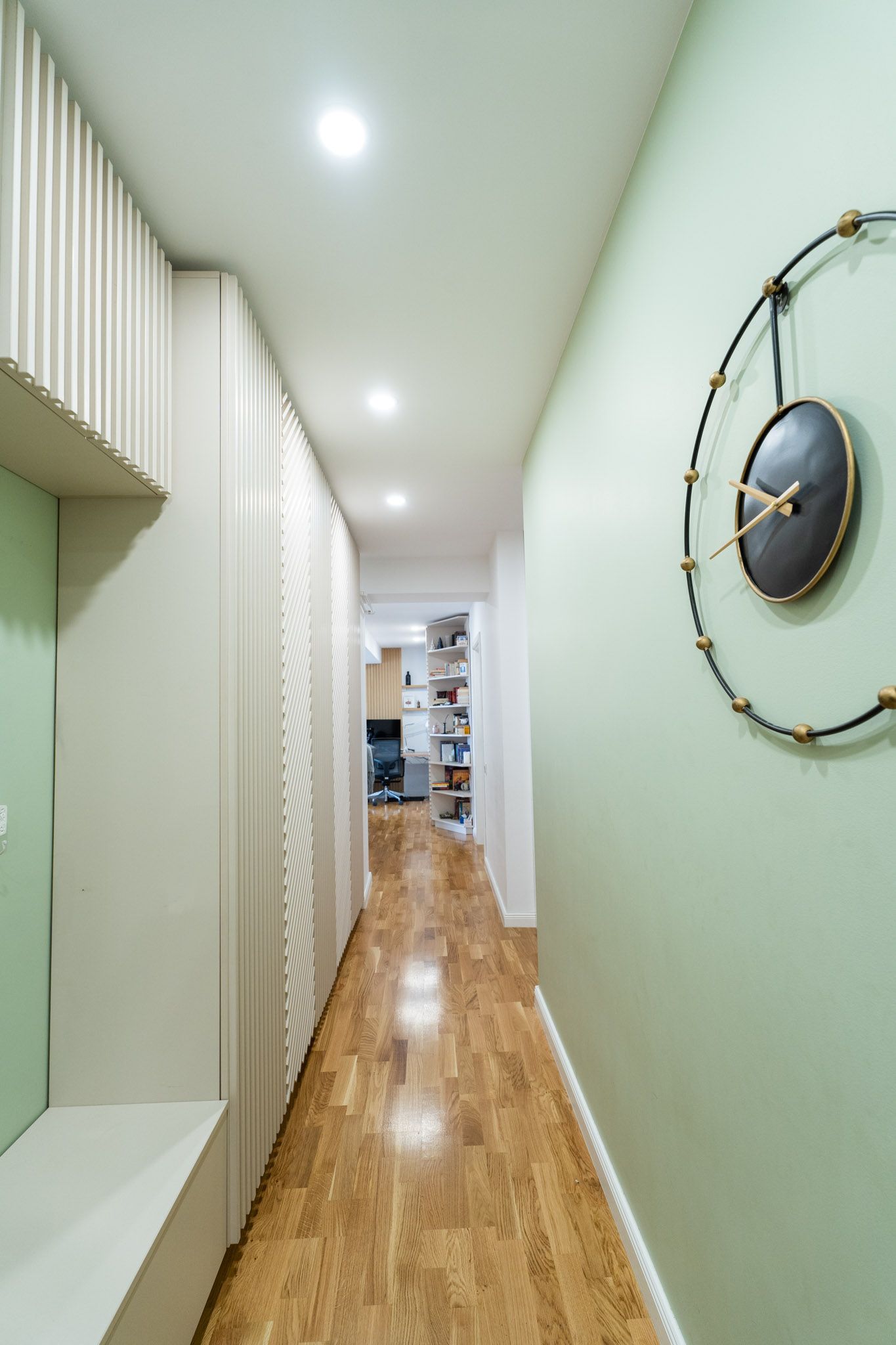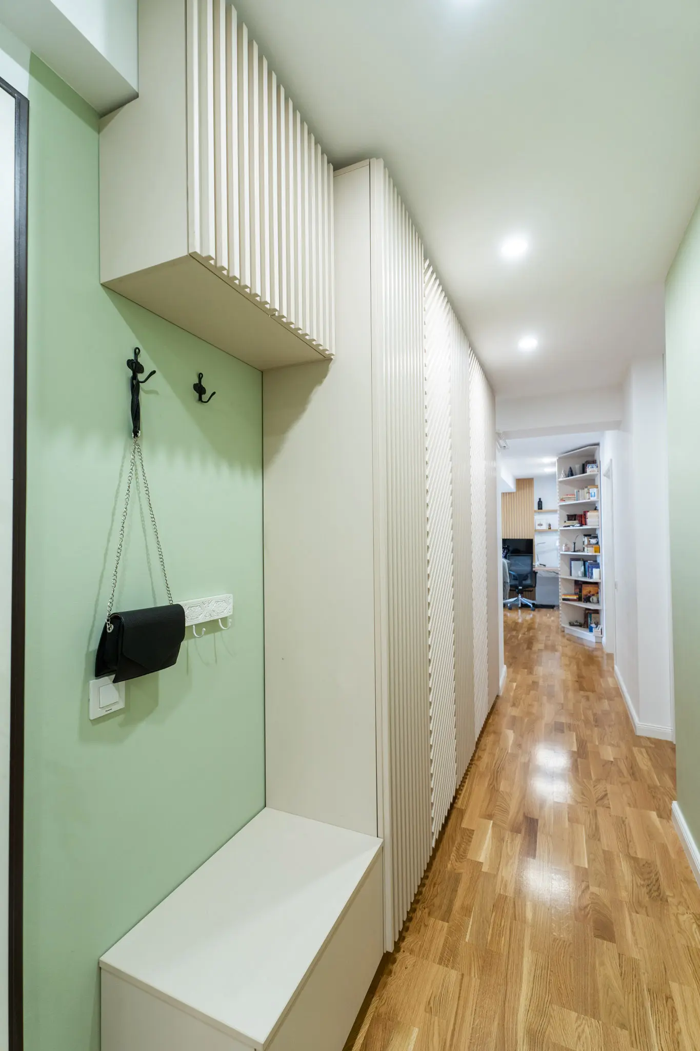 Fiind preluat de la dezvoltator cu finisajele realizate, interventiile la nivelul peretilor nu au fost mari. Arhitectii au propus crearea unor accente functionale si estetice atat prin riflaje de lemn cat si prin placari din mdf sau in cazul holului, usile de dulap cu riflaje dispuse alternativ, vertical si pe digonala, care confera spatiului un dinamism aparte.