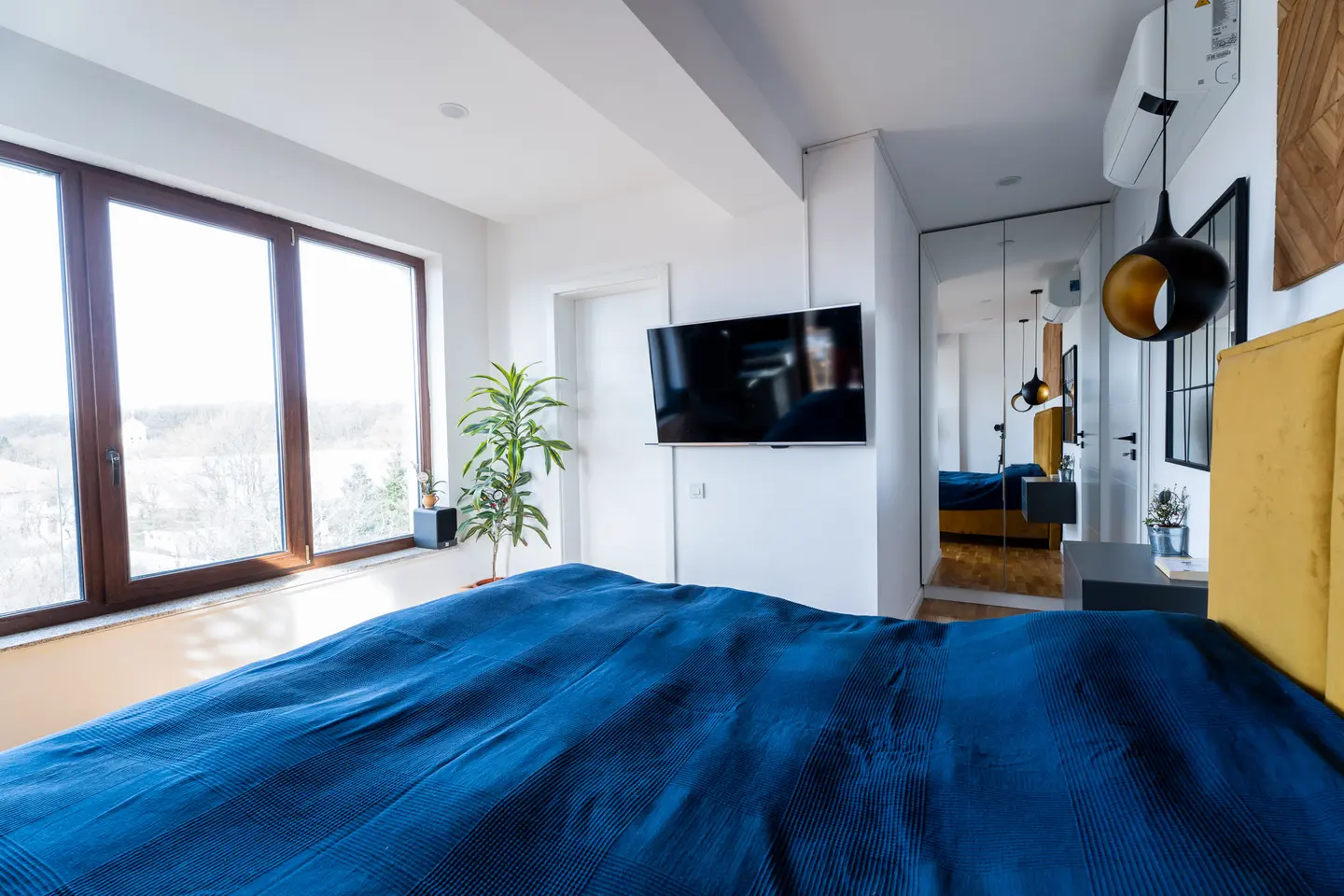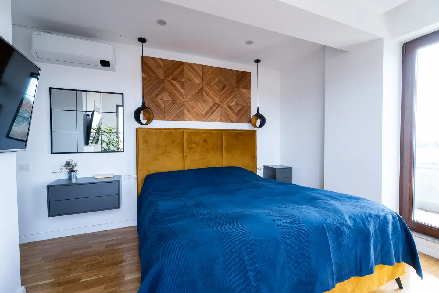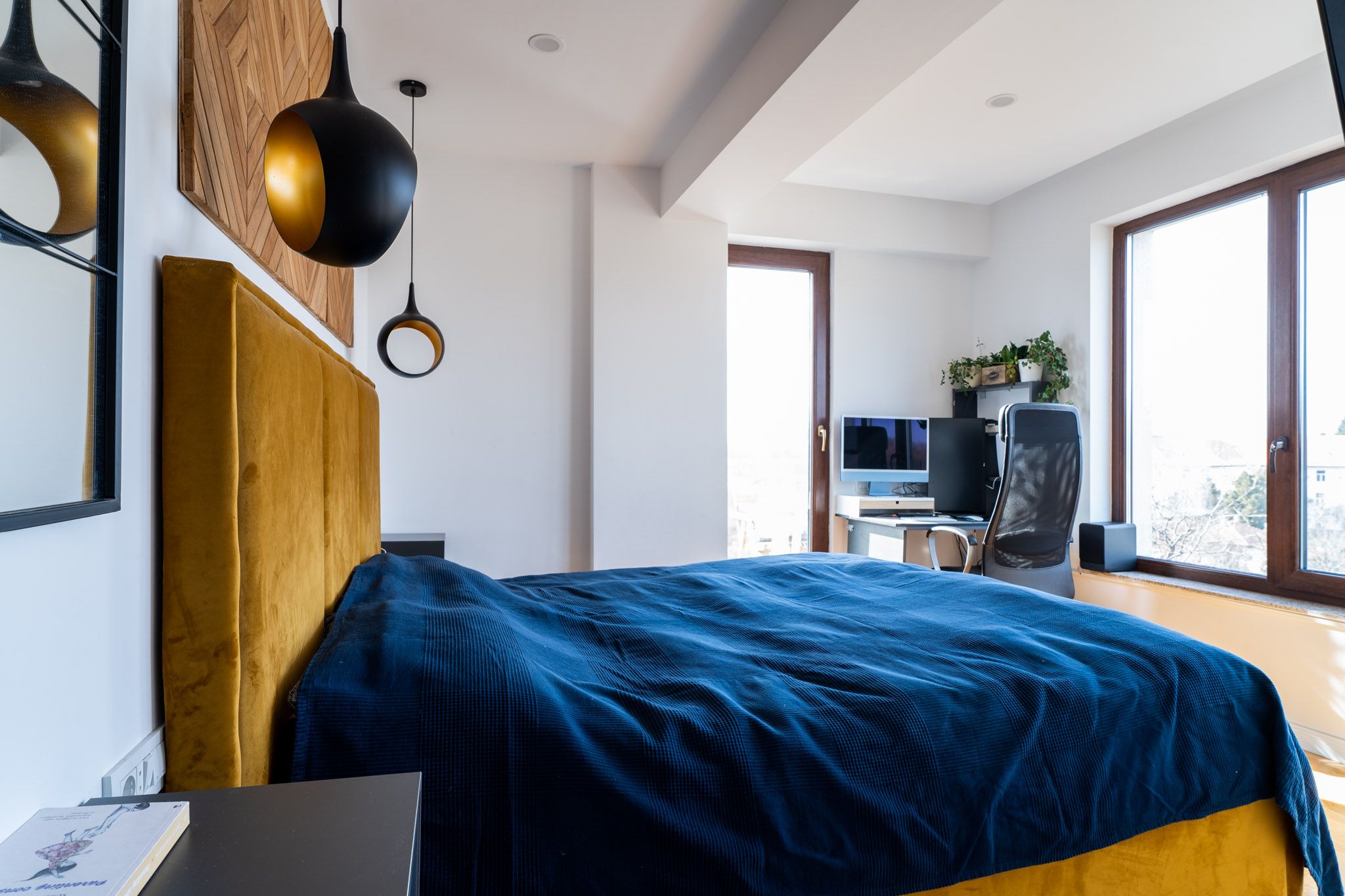 “Avem si aici accente de negru si auriu, panouri decorative din lemn deasupra patului si noptiere suspendate, gri, cu dimensiuni diferite. Piesa principala este patul tapitat, din care beneficiarii se bucura de privelistea oferita de ferestrele generoase.”