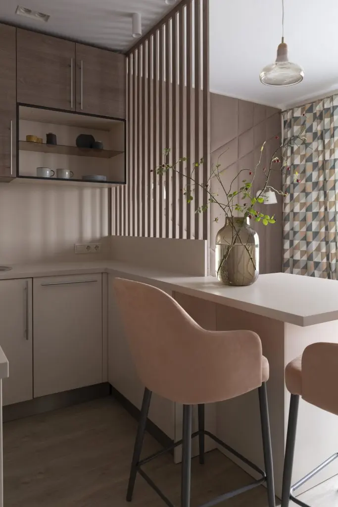 Detaliile de rezolvari estetice si functionale din aceasta amenajare sunt un exemplu graitor asupra multiplelor solutii de amenajare a unui spatiu mic. Un concept unitar si ritmul elementelor folosite constituie baza designului pentru spatii mici.