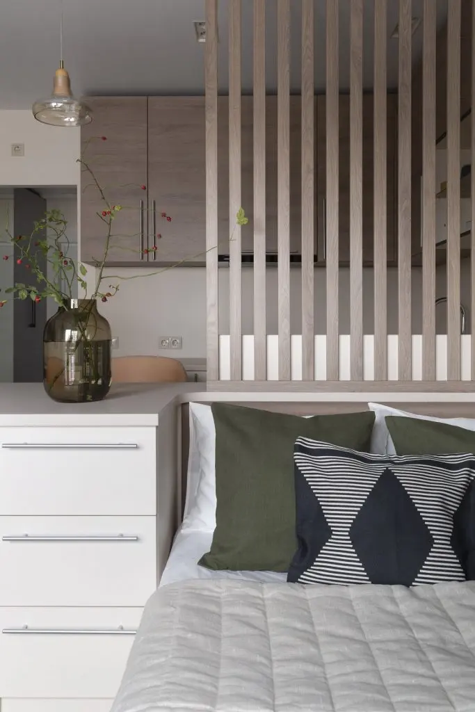 Patul incastrat intr-o nisa, este separat de bucatarie printr-un ritm de lamele de lemn, riflaj ce ii confera intimitate si in acelasi timp lasa lumina naturala sa inunde intreg spatiul. Cu somiera rabatabila, patul are o depozitare ascunsa extrem de utila.