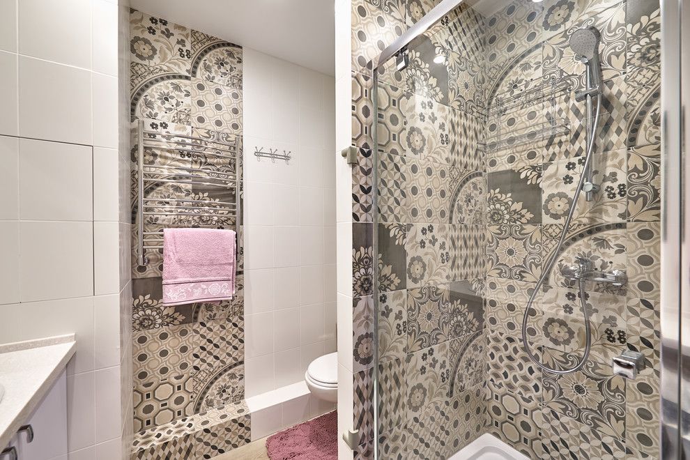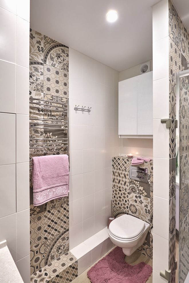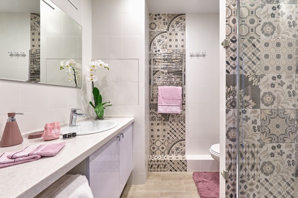 Spatiul baii respecta intr-o maniera cat mai precisa tendintele actuale: un blat pe lung care acopera si zona de depozitare, o oglinda supradimensionata, componente sanitare moderne si o zona separata pentru dus. Decorarea murala este cea care capata insemnatate, faianta prezentand patternuri florale in nuante derivate de maro si beige.