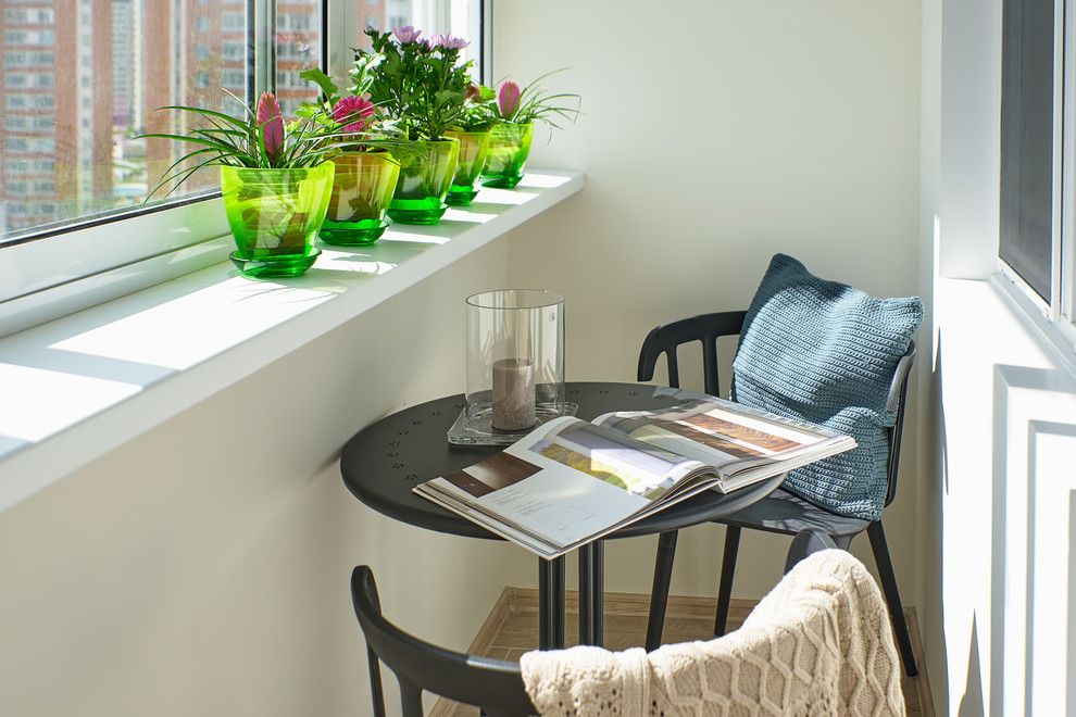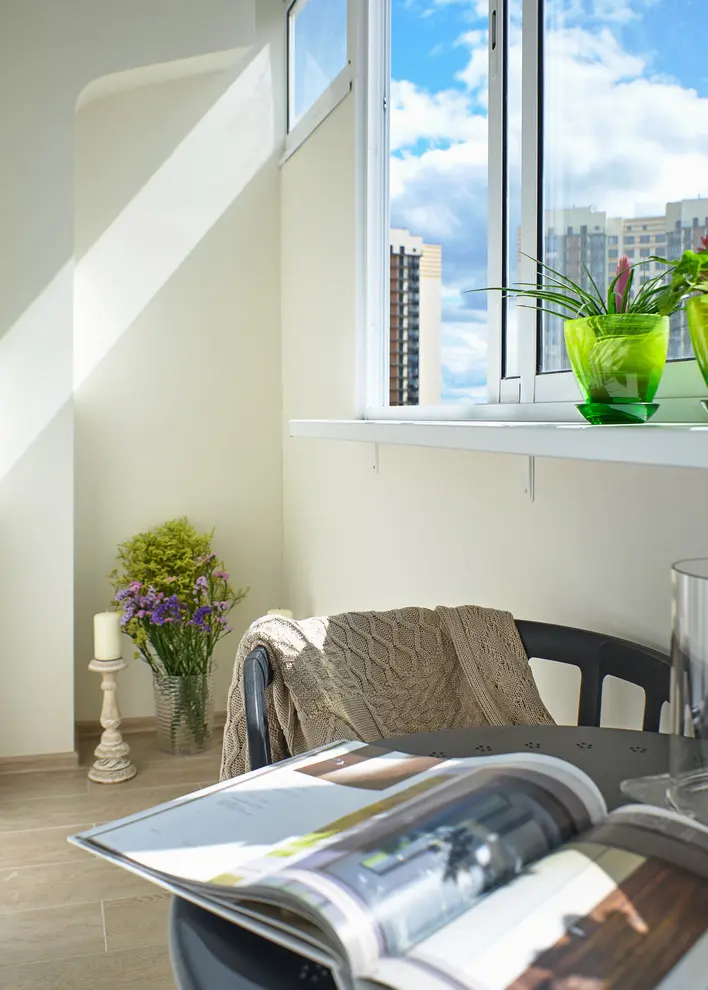 Spatiul dedicat odihnii, aflat de partea celalata a peretelui despartitor, este unul intim si relaxant. Nuantele derivate de gri, pastelurile si accentele de galben il ajuta sa ofere cadrul benefic unei odihni pe masura, asta cu ajutorul unui pat confortabil si a unui iluminat artificial discret.Avand la dispozitie o arie destul de restransa, pentru un confort maximizat este necesar ca fiecare spatiu sa fie exploatat la un nivel cat mai ridicat, astfel ca, aceasta amenajare ne prezinta transformarea balconului intr-un loc relaxant prin amplasarea unei mese rotunde si a doua scaune cu design minimalist intr-un cadru natural, accentuat de adaugarea ghivecelor cu flori.
