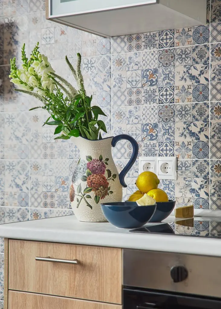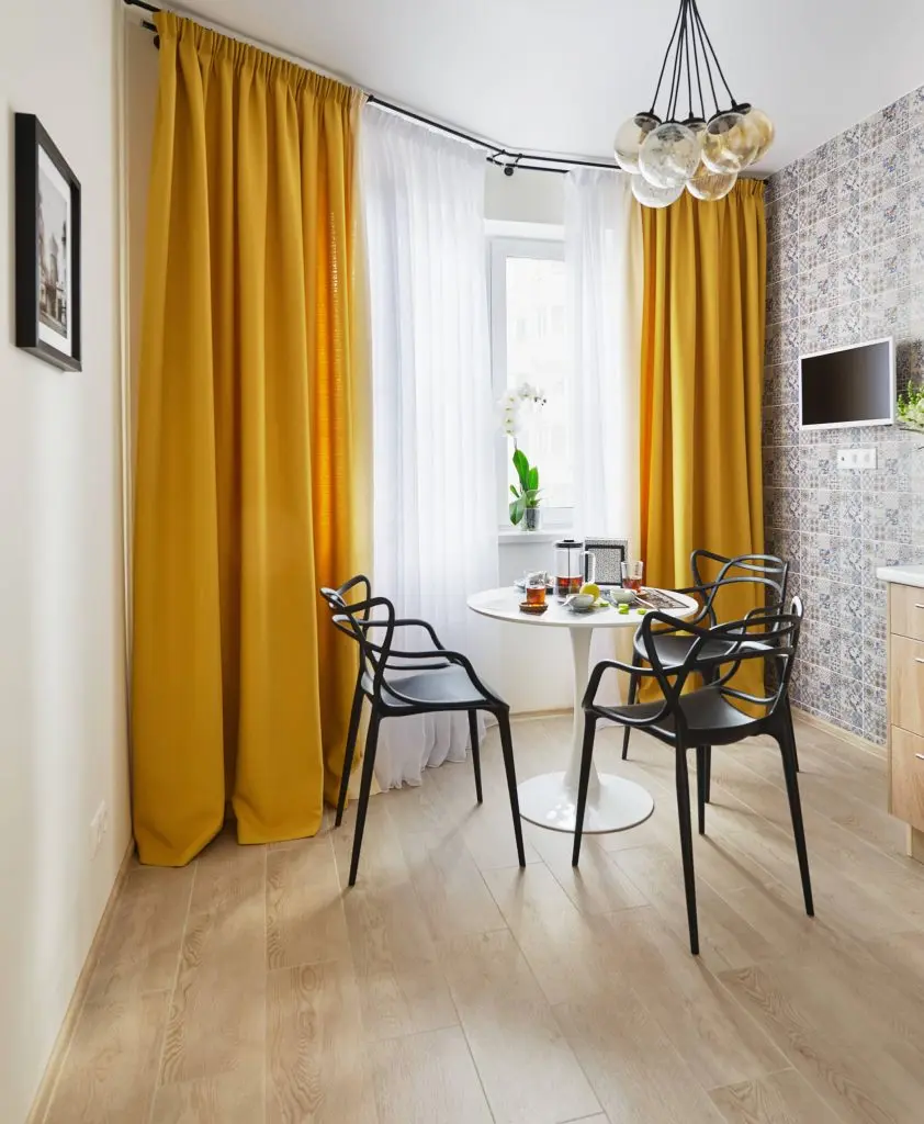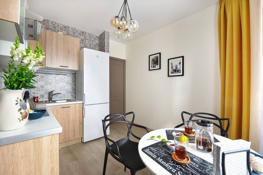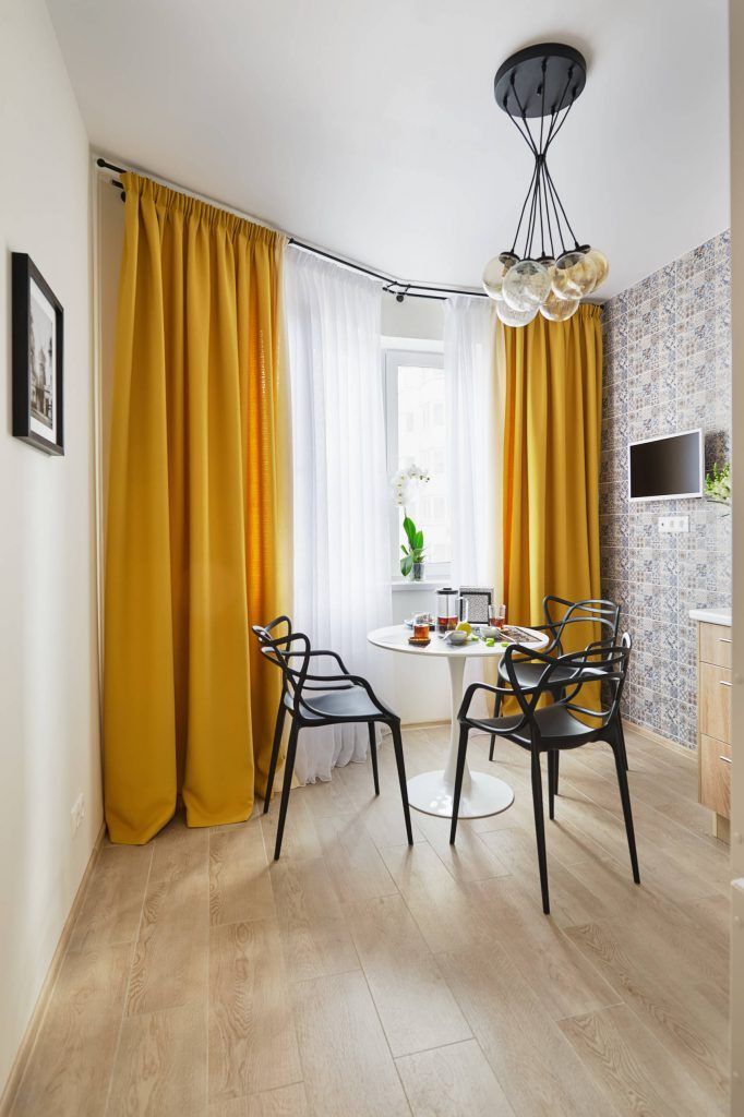 Bucataria are in componenta sa zona de pregatire a mesei si cea de dining, izolate uniform cu ajutorul detaliilor cromatice si compozitionale. Mobilierul este unul in linii simple si se continua cu naturaletea lemnului, prezent atat in compozitia sa, cat si in podea. Pentru a se pastra o atmosfera clasica, se opteaza pentru un perete decorat cu placi de faianta ce infatiseaza patternuri vintage. Modernismul isi face loc prin intermediul zonei de dining unde, toate componentele au un caracter minimalist si contemporan. Vorbim in acest caz de o masa rotunda cu un singur picior, 3 scaune cu design abstract si corpuri de iluminat ce pastreaza acelasi stil. Pentru ca galbenul este nuanta care capata un rol principal in aceasta transformare, culoarea draperiilor aduce un plus de caldura si voiosie intregului spatiu.