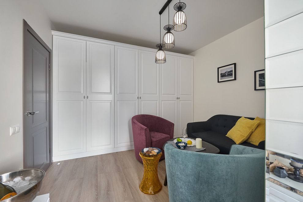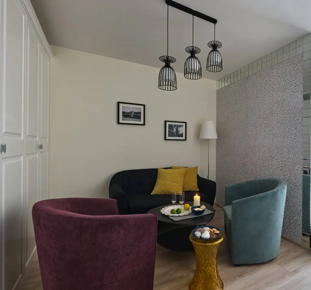 Pentru spatiul dedicat living-ului se aduc laolalta o canapea, doua fotolii si o masuta de cafea, toate cu design modern. In cazul acestor componente de mobilier catifeaua colorata este cea care aduce in discutie un vibe energic perfect pentru petrecerea unui timp de calitate acompaniat. Tot aici regasim un dressing care ocupa intreaga suprafata a peretelui care face legatura cu exteriorul si o biblioteca, ambele cu un stil ce alege linia clasica.